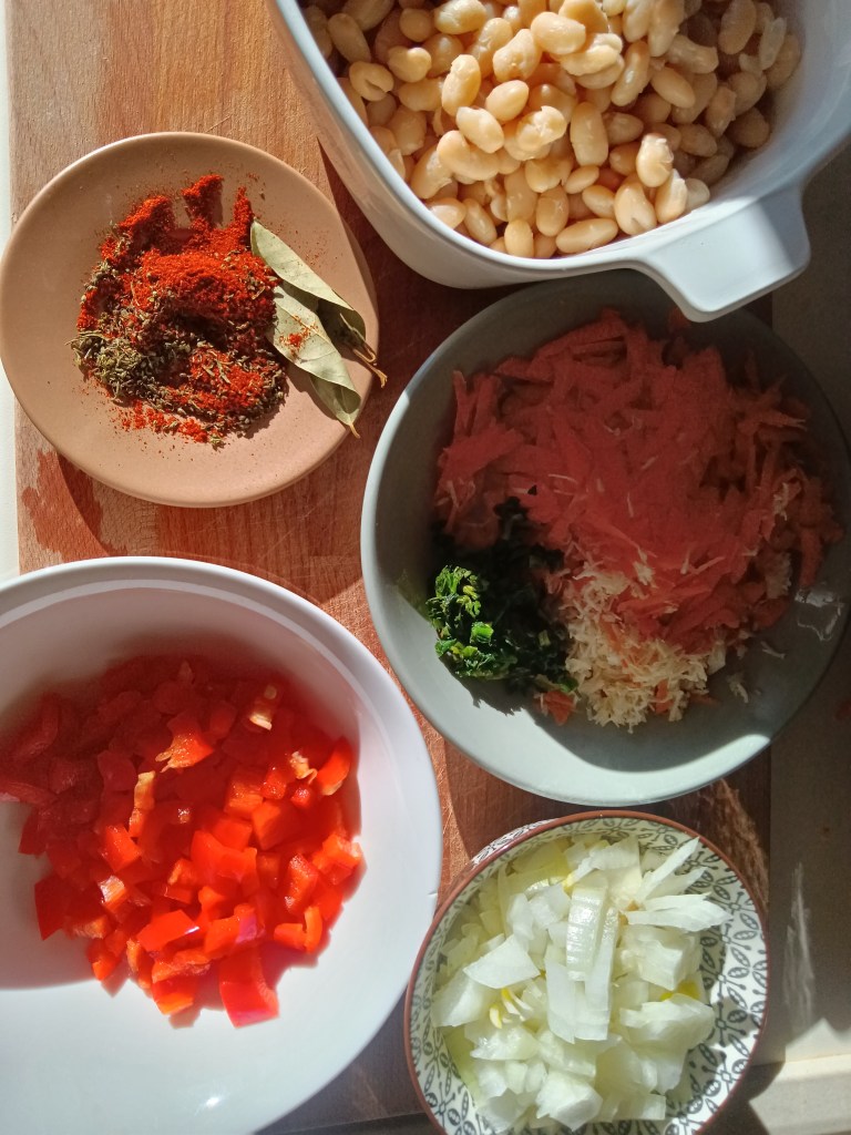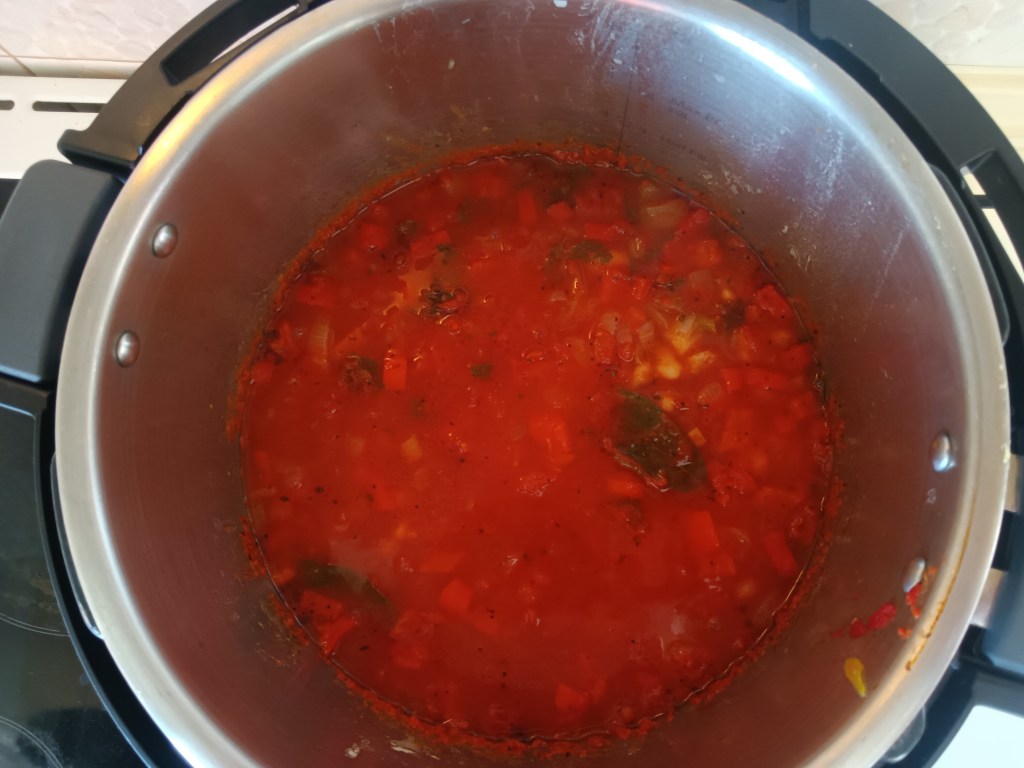3. Am adăugat fasolea fiartă dimineață, lingura de bulion de roșii și condimentele. Am pus și apă cât să acopere aproape toată fasolea. ⚠️ Atenție! Nu acoperim cu apă și nu adăugăm foarte multă apă pentru că nu se va evapora și riscăm să avem mult lichid la final.