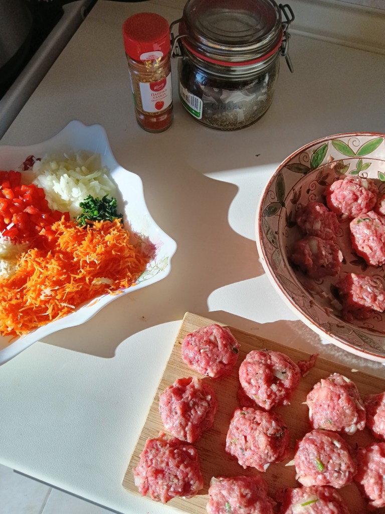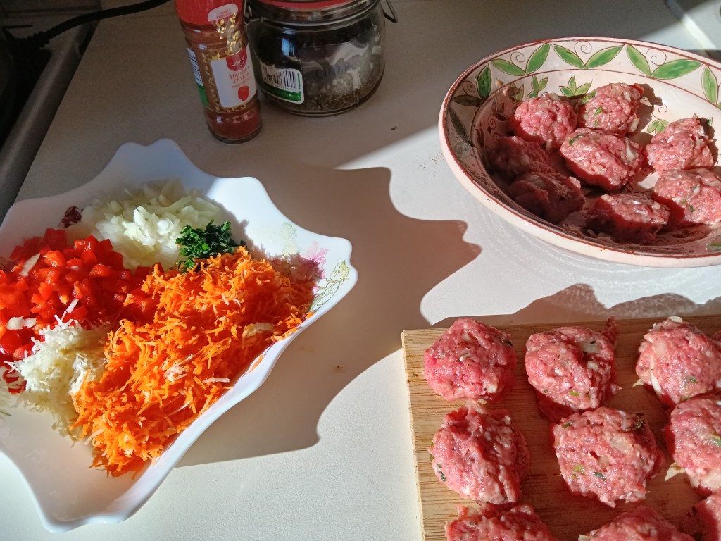 1. Am tăiat ceapa, ardeiul gras și frunzele de țelină. Apoi, am dat pe răzătoarea mică morcovul și felia de țelină. Am amestecat toate ingredientele pentru perișoare și am obținut 20 de bucăți.