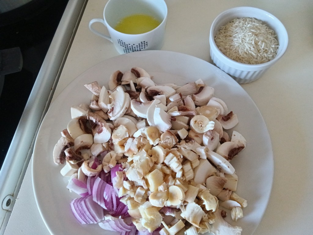 1. Am tăiat ceapa și ciupercile în bucăți mici, am spălat orezul și am pregătit sucul de lămâie, dar și cașcavalul.