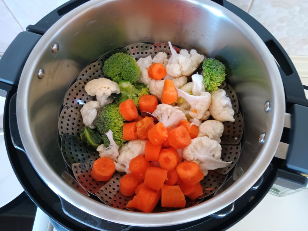 2. În multicookerul Instant Pot am adăugat cana cu apă, am pus sita pentru gătit la aburi, am adăugat legumele și am setat funcția PRESSURE Cook, High, 1 minut.