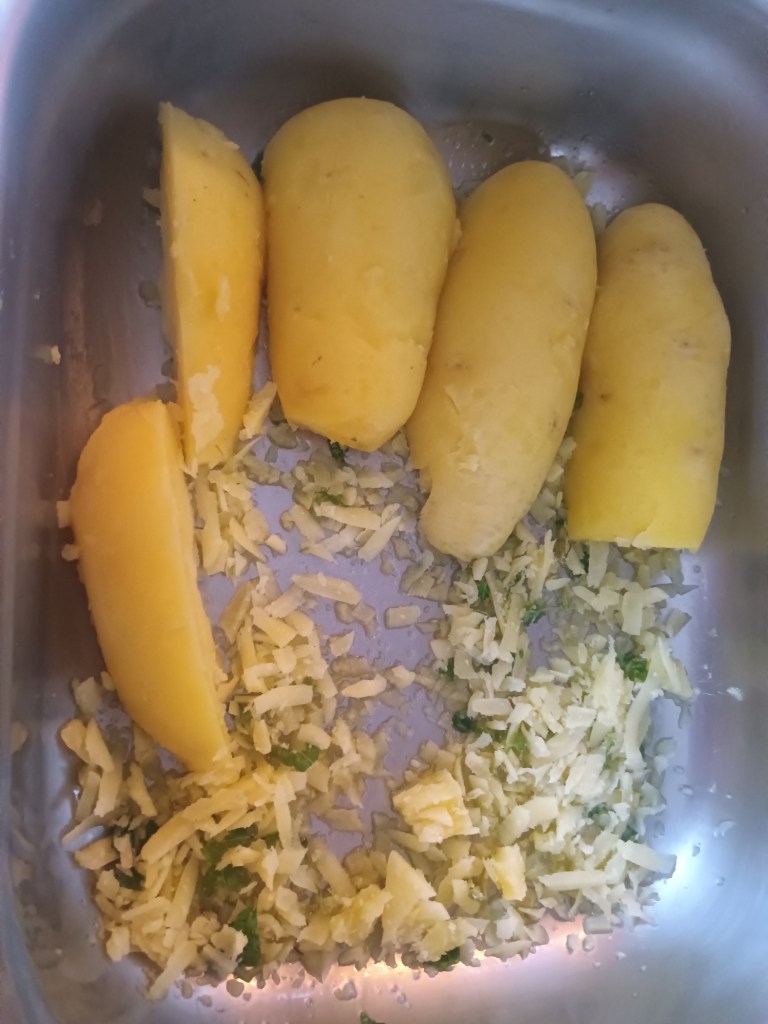 2. Între timp, am pregătit vasul pentru cuptor. L-am uns cu ulei, am adăugat un strat de cașcaval amestecat cu busuioc verde. Când cartofii au fost gata, i-am tăiat în două, i-am curățat de coajă și i-am pus în vas. I-am uns cu ulei, usturoi, cimbru, boia dulce de ardei, sare și piper.