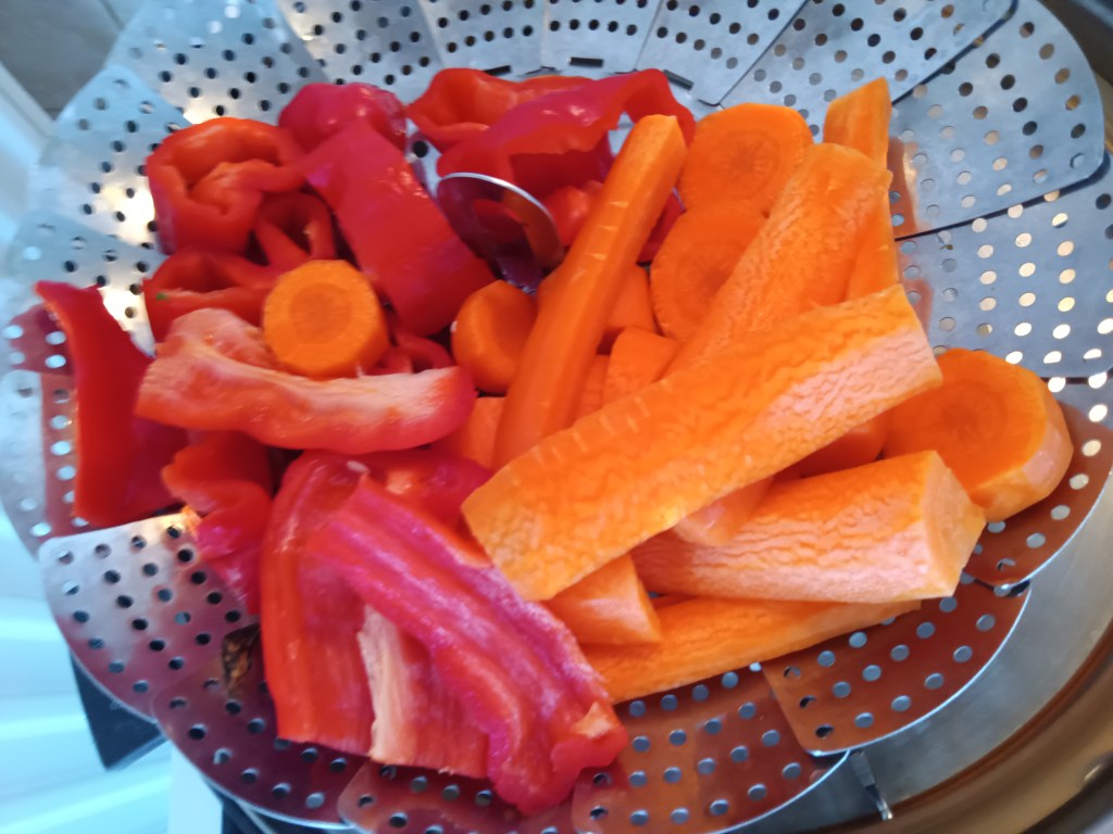 2. Am oprit funcția SAUTE, am adăugat o cană și jumătate de apă, am curățat bine cu spatula partea de jos a vasului, am adăugat o cană de orez și peste el am pus sita pentru legume la aburi. Am adăugat doi morcovi tăiați, ardeiul gras și carnea.