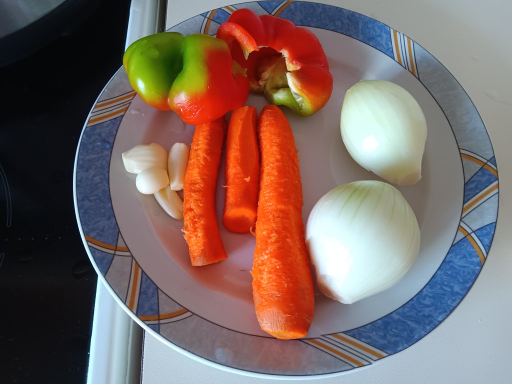 1. Am tăiat ceapa, ardeiul gras, frunzele de busuioc proaspăt. Apoi, am dat pe răzătoarea mică morcovul și usturoiul.