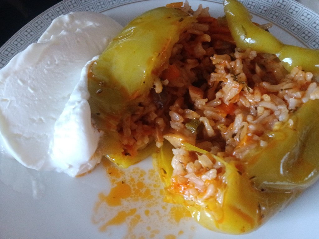2. Am pus amestecul în alt vas și am adăugat în oală cealaltă jumătate de cană de apă, rosiile, un pic de cimbru și foaia de dafin. Am pus trivetul primit atunci când am cumpărat multicookerul. Am adăugat ardeii umpluti si am selectat Pressure Cook, High, 15 minute.
