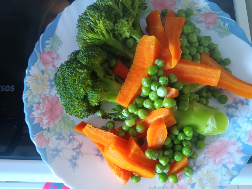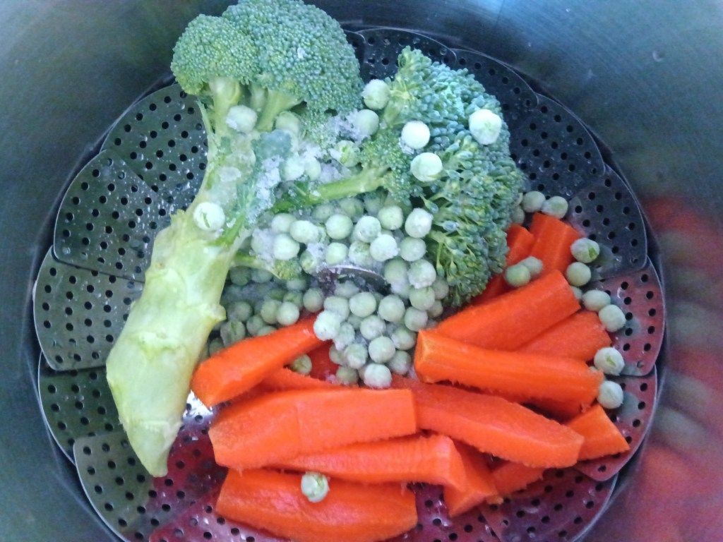 1. Am pus în vasul de inox al multicooker-ului o cană de apă fierbinte, am așezat sita și în ea am pus broccoli, doi morcovi tăiați și o cană de mazăre congelată. Am setat Pressure Cook, High, 1 minut.