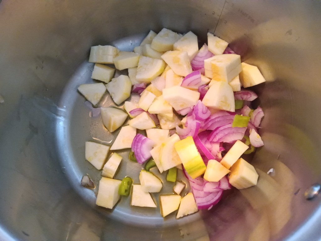 3. Când legumele au fost gata, am scos repede presiunea folosind QR, am luat legumele, am aruncat apa și am pus iar vasul de inox in multicooker. Am adăugat ulei de măsline, ceapa, ardeiul iute și dovlecelul și am pornit opțiunea SAUTÉ.