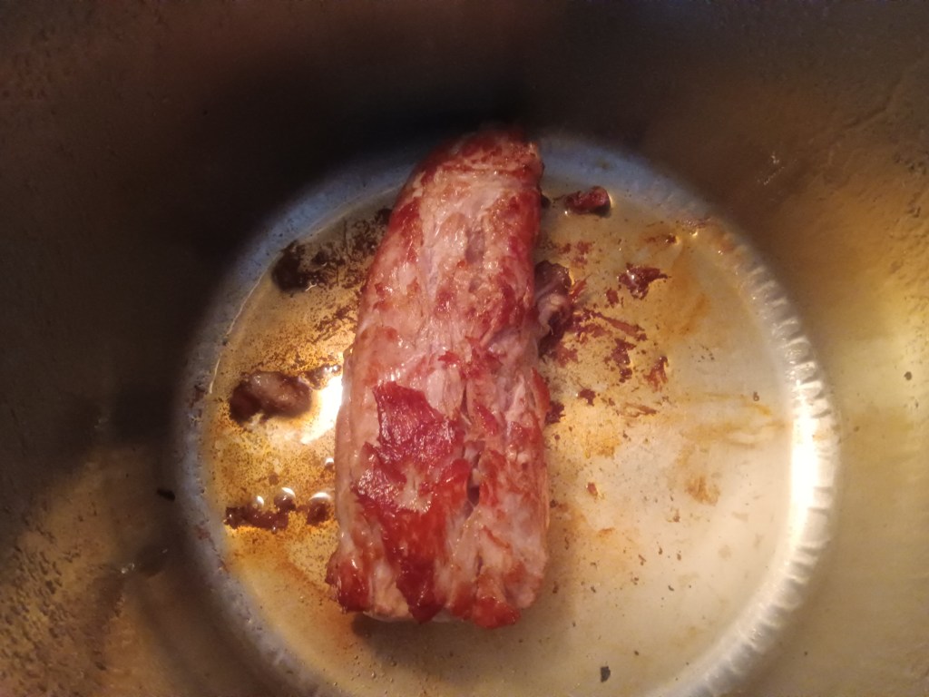1. Am pus în vasul de inox al multicooker-ulu untul și o lingură de ulei și am selectat opțiunea SAUTÉ. . Am adăugat mușchiul de porc și l-am sotat pe toate părțile, până a prins o culoare frumoasă. Aproape șase minute mi-a luat mie.