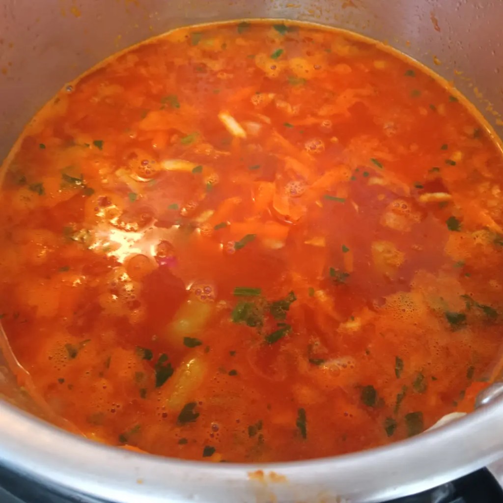 5. Când a expirat timpul, am scos presiunea, am adăugat 1.5l de borș, leușteanul și cele două cuiburi de fidea și am apăsat opțiunea SAUTE, lăsând să dea borșul in clocot.