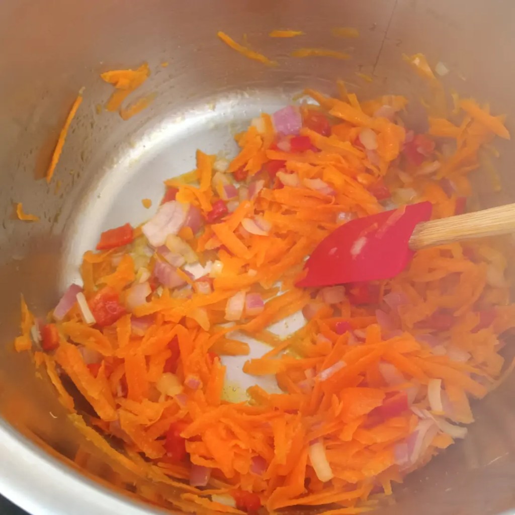 1. Am tăiat toate legumele, am dat pe răzătoarea mică usturoiul și pe cea mare morcovul. Am pornit multicooker-ul selectând funcția SAUTÉ. Am adăugat lingura de ulei și lingura de apă și am înăbușit usturoiul și ceapa pentru 15 secunde. Am pus ardeiul gras și morcovul, am adăugat năutul fiert și condimentele (mai puțin pătrunjelul).