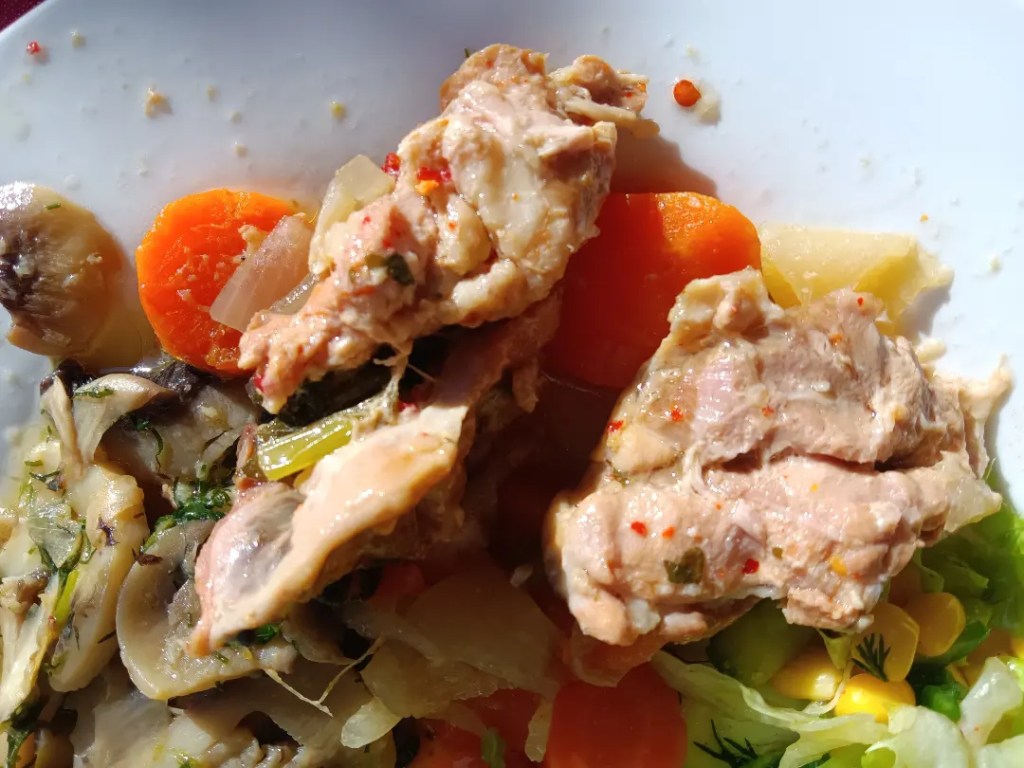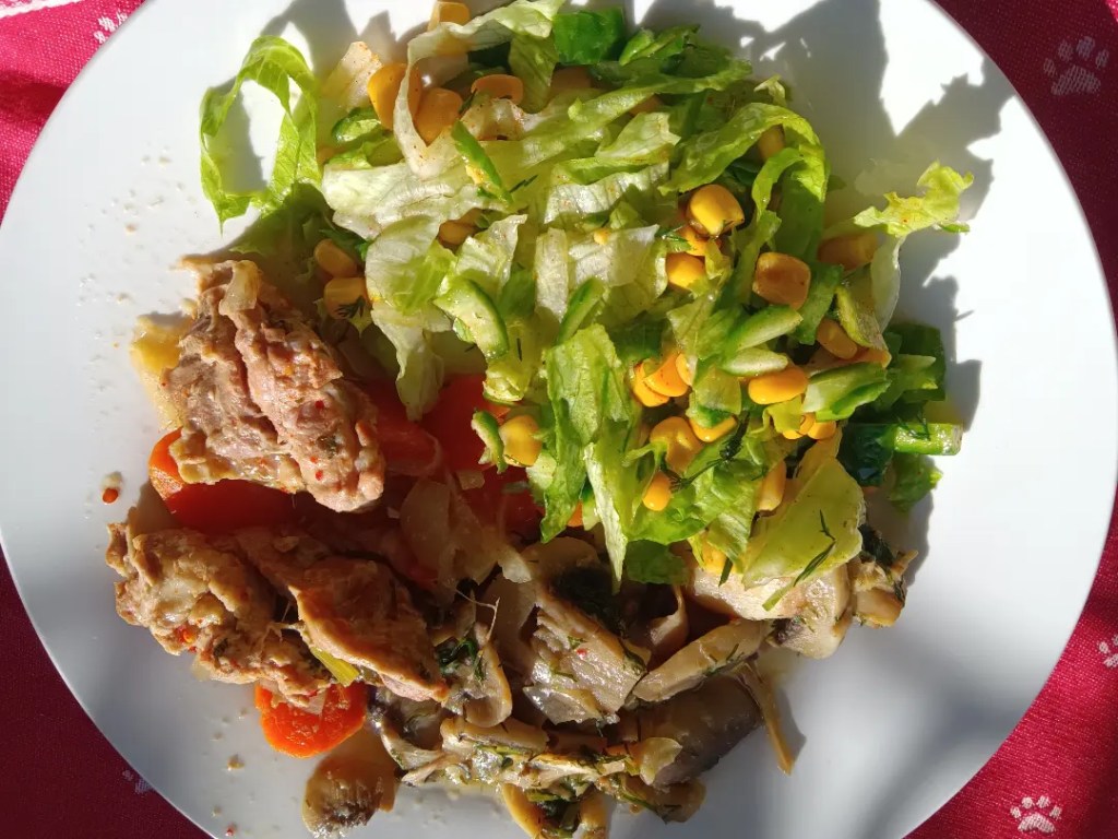 Noi l-am servit cu salată verde cu morcovi și porumb, dar și cu ciuperci pregătite la Instant Pot (Pressure Cook, High, 2 minute).
