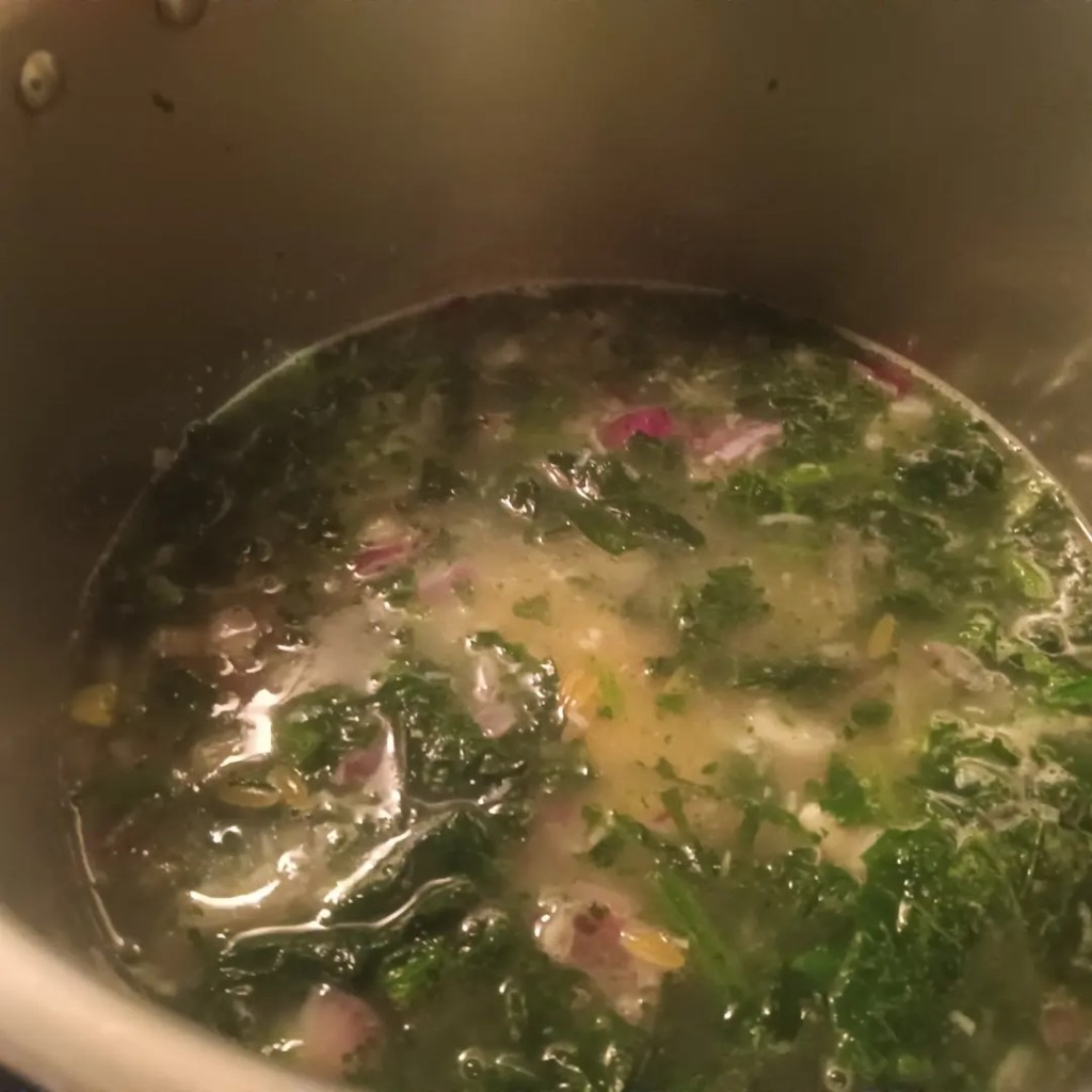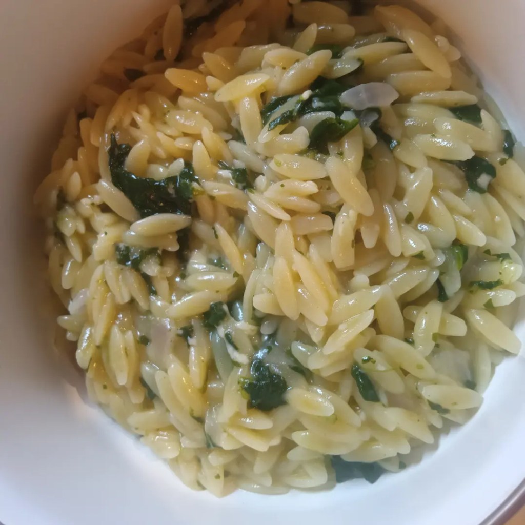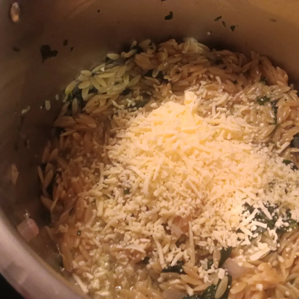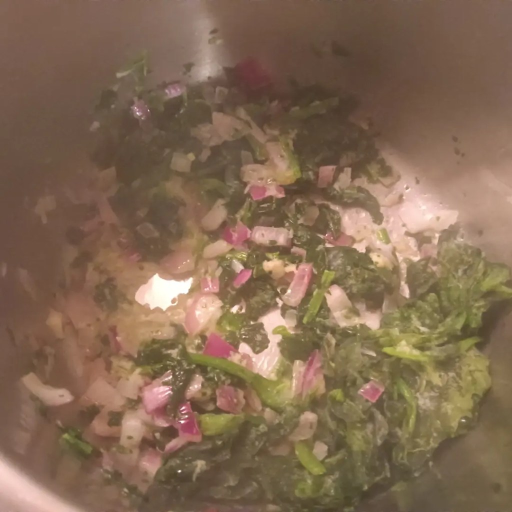 1. În multicookerul #instantpot am setat funcția SAUTÉ și am pus o jumătate de lingură de ulei și cele 30 g de unt. Am sotat ceapa, usturoiul și spanacul. După două minute, am adăugat apa și orzo. Am oprit funcția de sotare.