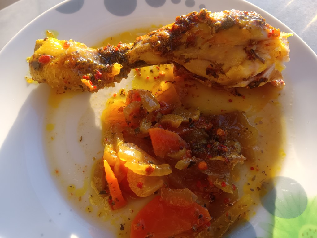1. Am pregătit întâi marinata combinând toate condimentele și sucul de lămâie. Am adăugat amestecul peste pui, l-am lăsat deoparte. Între timp, am pregătit legumele: am tăiat ceapa in solzișori, iar morcovul în rondele.