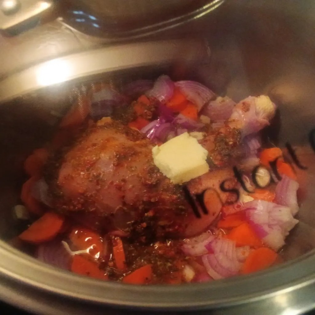 Las aici încă o rețetă pregătită folosind opțiunea Slow Cook a Instant Pot-ului. Este pui cu legume în sos de lămâie cu unt, boia dulce, cimbru și curcuma.