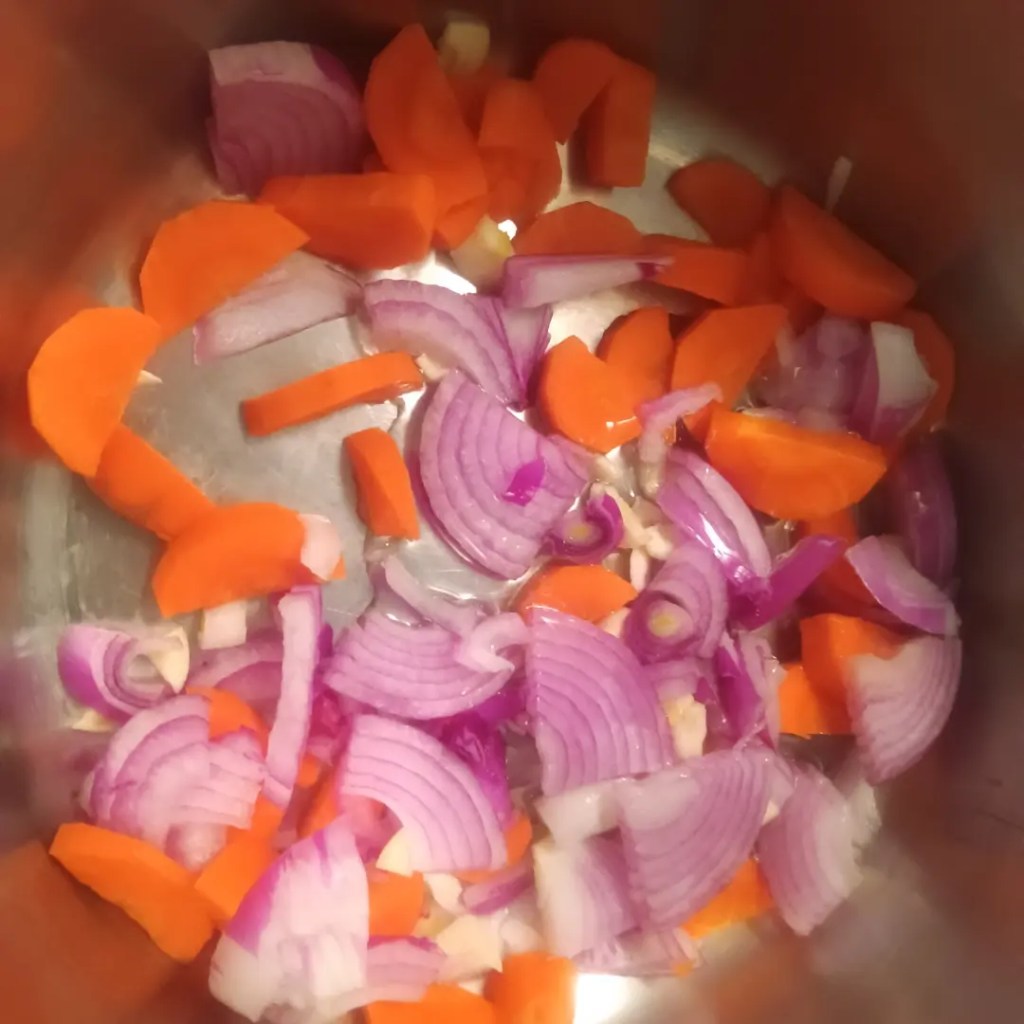 2. Când totul a fost gata, am pus ceapa și morcovul în vasul de gătit, peste ele am adăugat apa, uleiul și untul. Deasupra am pus pulpa de pui și sosul care rămăsese de la marinat.