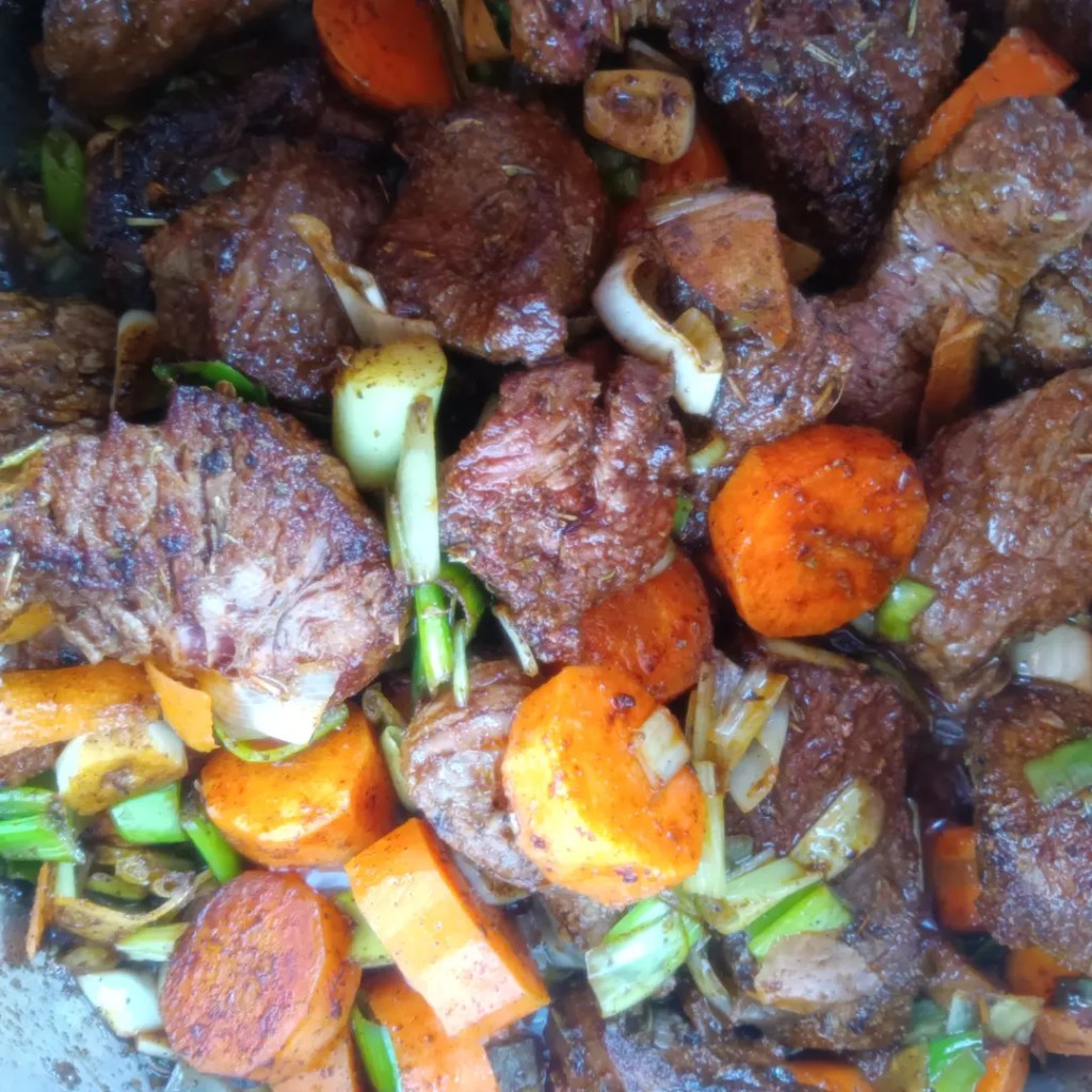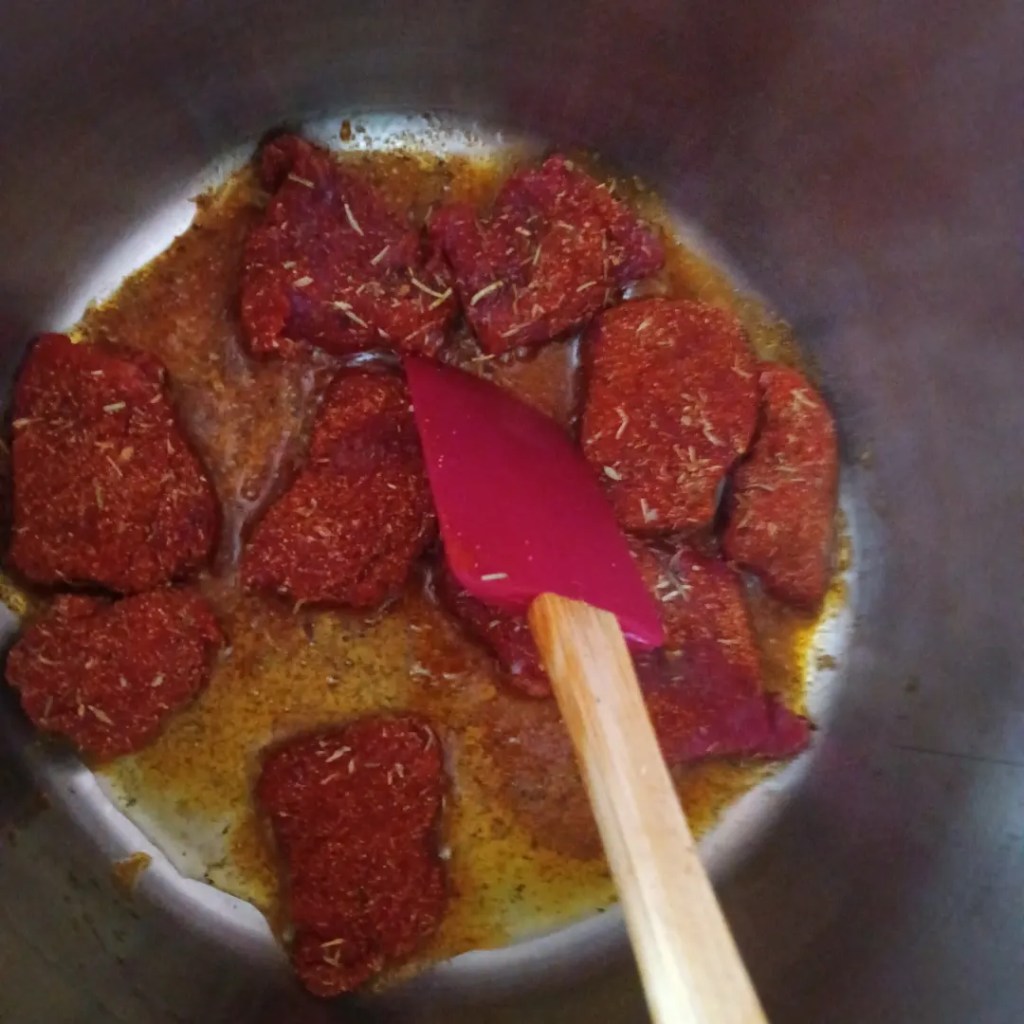 1. Am pregătit mușchiul de vită, tăindu-l in cuburi potrivite. Într-un bol mic am amestecat toate condimentele, mai puțin frunza de dafin. Am trecut fiecare bucată de carne prin amestec și apoi am pus-o in vasul de inox. Am activat opțiunea SAUTÉ și am rumenit pe toate părțile carnea (aproximativ două minute pe fiecare parte). Când carnea a fost gata, am scos-o și am călit două minute toate legumele (prazul, usturoiul și morcovul). Am dezactivat opțiunea SAUTÉ.