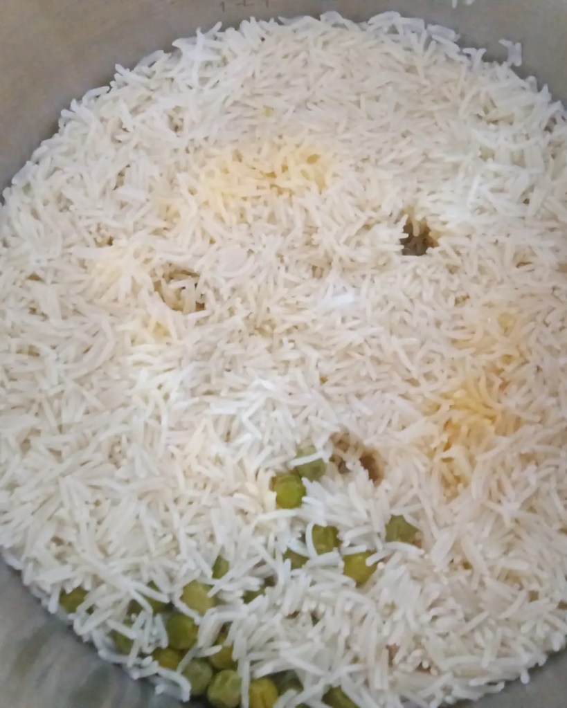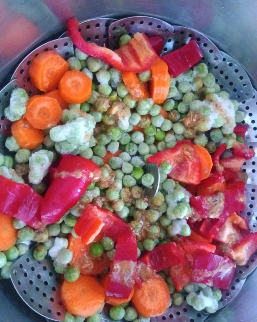 3. Am uscat bine vasul de inox și l-am pus iar în multicooker, am adăugat cubul de unt, cana de orez si cana cu apă. Deasupra am pus sita pe care am adăugat morcovul, ardeiul kapia și mazărea. Am adăugat peste ele puțin din sosul pus la carne. Am închis capacul, an selectat Pressure Cook, High, 5 minute.