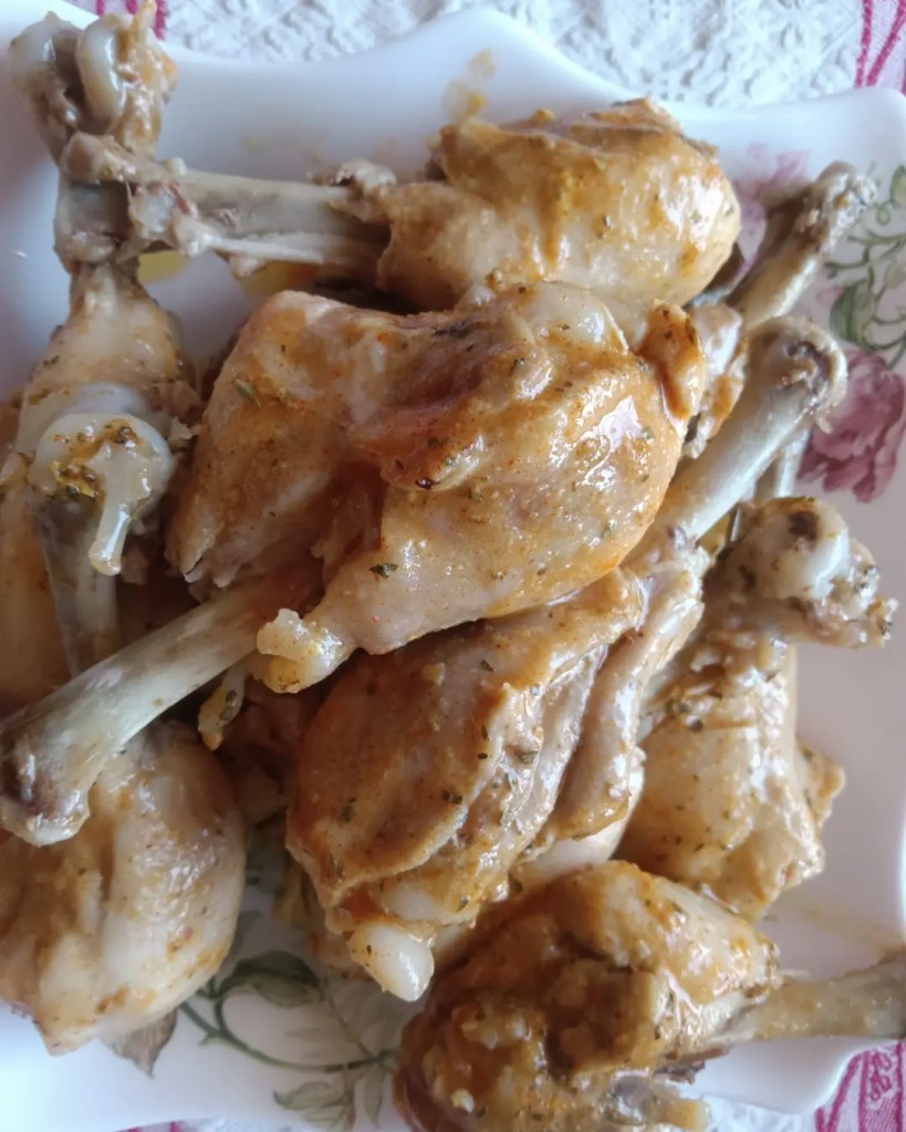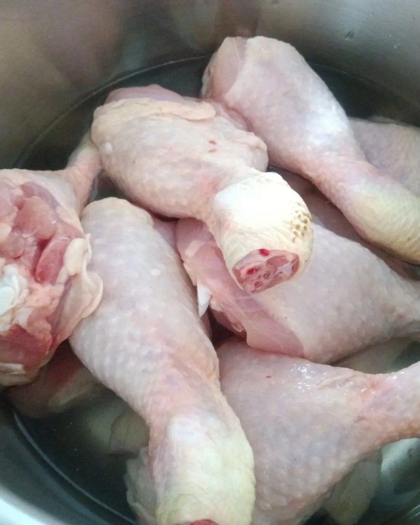 2. Când pulpele au fost gata, am scos repede presiunea (QR), am scos pulpele pe o farfurie și am strecurat apa in care a fiert carnea (voi folosi o parte din ea pentru a pregăti orezul). Am spălat vase de inox Între timp, am dat drumul la cuptor, la 180 de grade, ventilație sus-jos. Am luat pielea de pe fiecare bucată de carne și am eliminat bucățile de sfârc de la capăt. Am trecut fiecare pulpă prin sos, le-am pus în tavă și le-am lăsat la cuptor până s-au rumenit, intorcandu-le doar o singură dată.