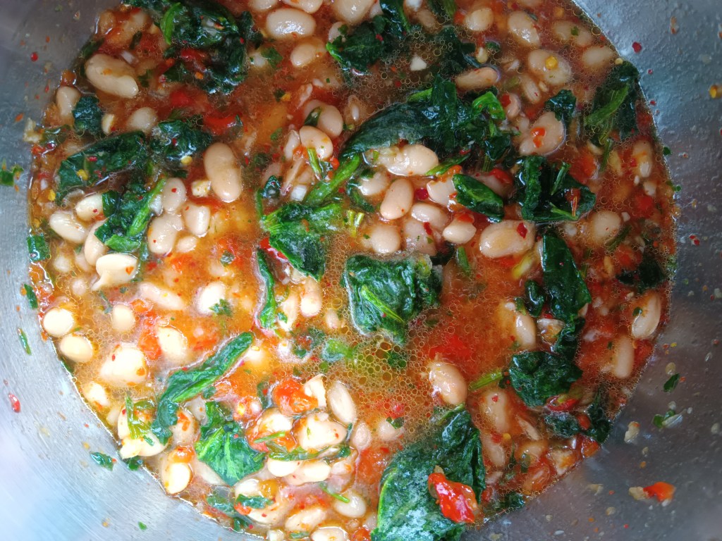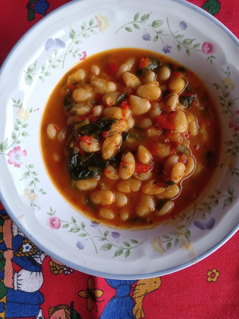 Astăzi am pregătit fasole picantă cu sos de ardei copt și spanac. Am adăugat în vas 250 g de fasole albă uscată, patru căni de apă, am selectat Pressure Cook, High, 20 de minute. Am lăsat să scadă singură presiunea 10 minute. Jumătate din cantitatea de fasole a fost folosită pentru a face o ciorbă de fasole, cealaltă jumătate pentru a face rețeta de fasole picantă pentru noi, părinții