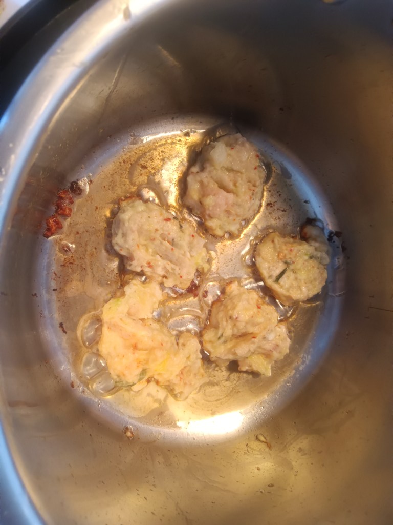 2. În vasul Instant Pot-ului am adăugat ulei de măsline și o linguriță de unt și am dat drumul funcției SAUTÉ. Am prăjit chifteluțele până au căpătat puțină culoare (aproximativ două minute pe fiecare parte). Eu le-am adăugat cu lingura, cam jumătate de lingură pentru câte o chifteluță.