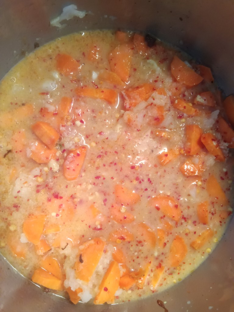3. Când am terminat de prăjit, le-am scos din vas și am adăugat două linguri de apă. Apoi am pus ceapa, usturoiul, morcovul și firele de busuioc. Am adăugat peste ele sosul obținut din amestecul de muștar, miere, boia dulce, frunze de busuioc și jumătate de cană de apă fierbinte.