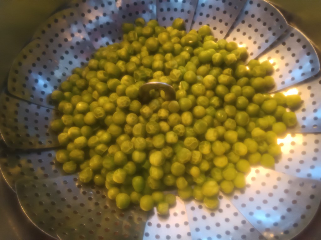 Am pus chiftelele, am adăugat și restul de apă fierbinte rămasă (chiar și după ce am adăugat acest rest de apă, nivelul de lichid din vas nu era la nivelul chiftelelor, era suficientă apă ca să nu dea BURN și să obținem un sos bun) am pus și sita pe care se aflau boabele de mazăre congelată.