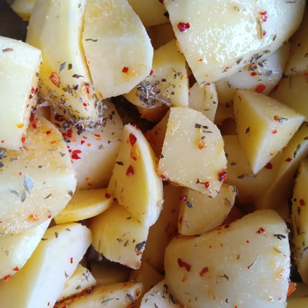1. Am tăiat cartofii în cuburi. Peste ei am adăugat jumătate de lingură de ulei de măsline, jumătate de linguriță de cimbru, o linguriță de boia dulce, jumătate de linguriță de piper și un sfert de linguriță de sare. Le-am amestecat bine.