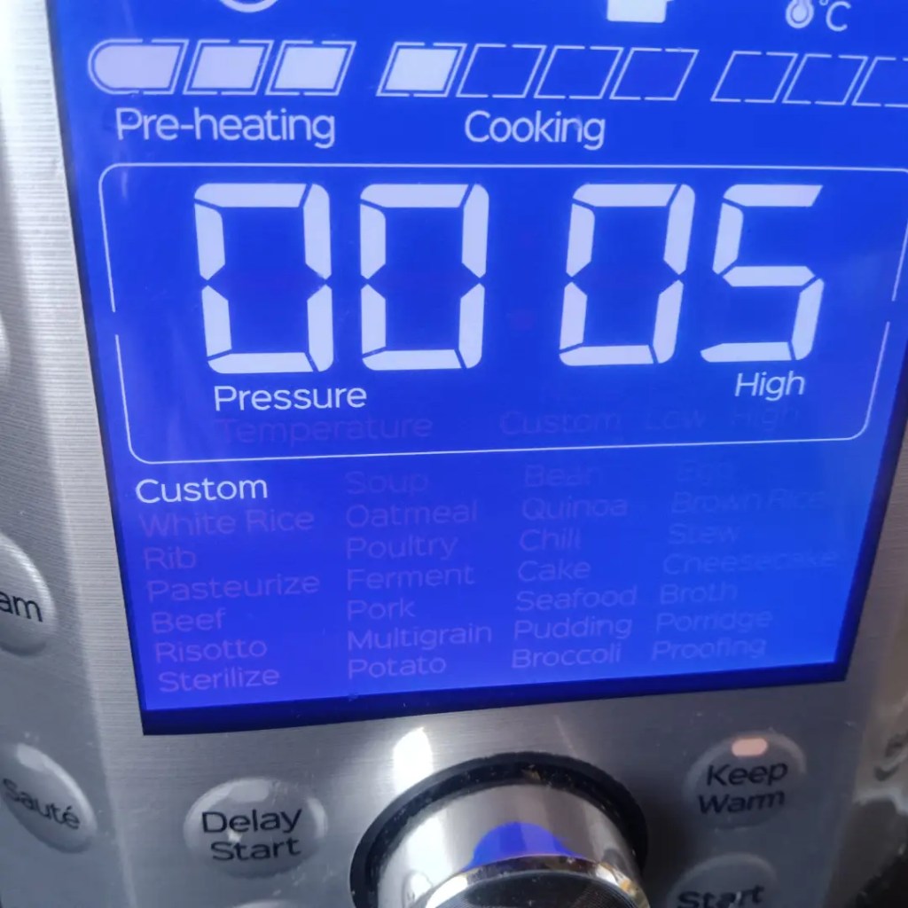 4. Am adăugat apă fierbinte, am amestecat și am închis capacul. Am selectat Pressure Cook, High, 5 minute. Când a expirat timpul, am scos presiunea (QR).