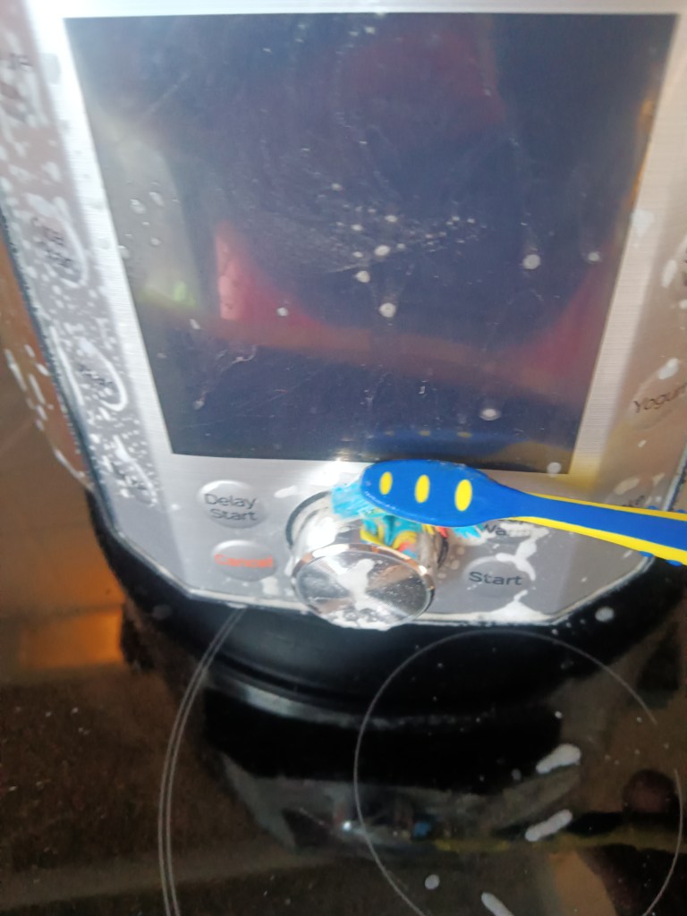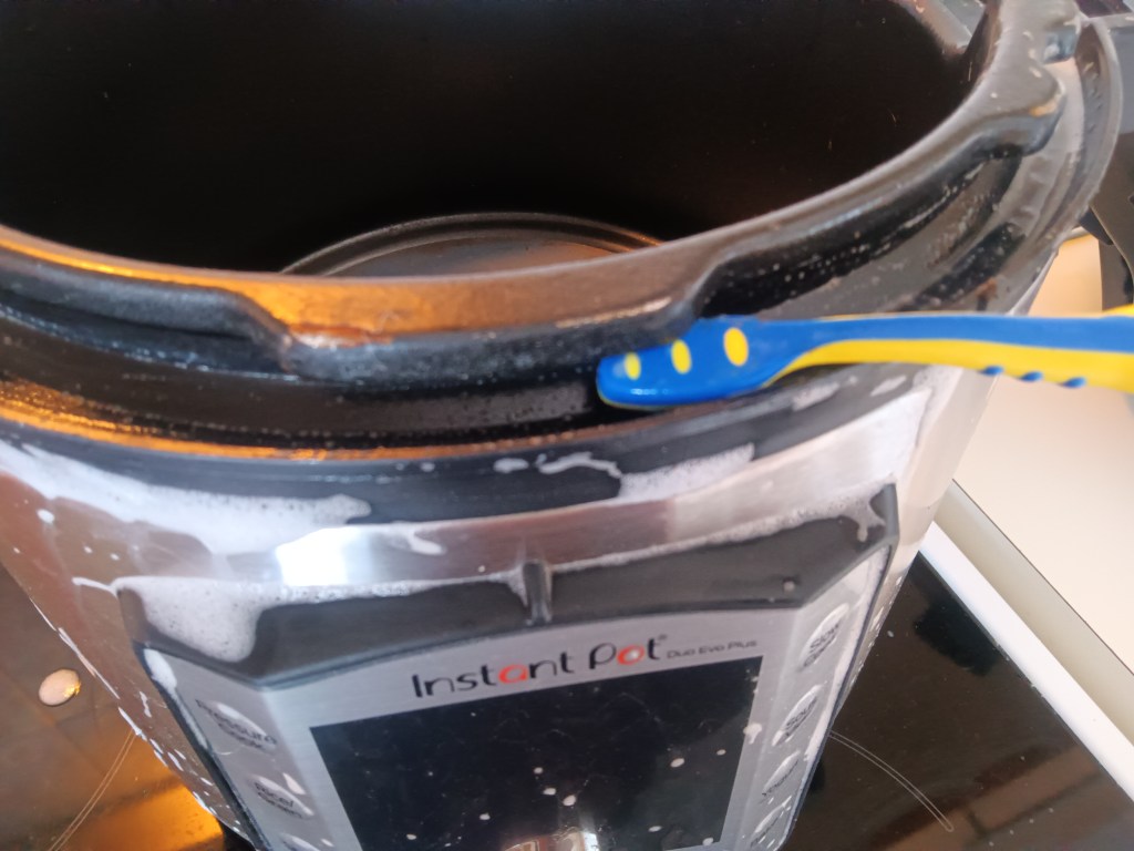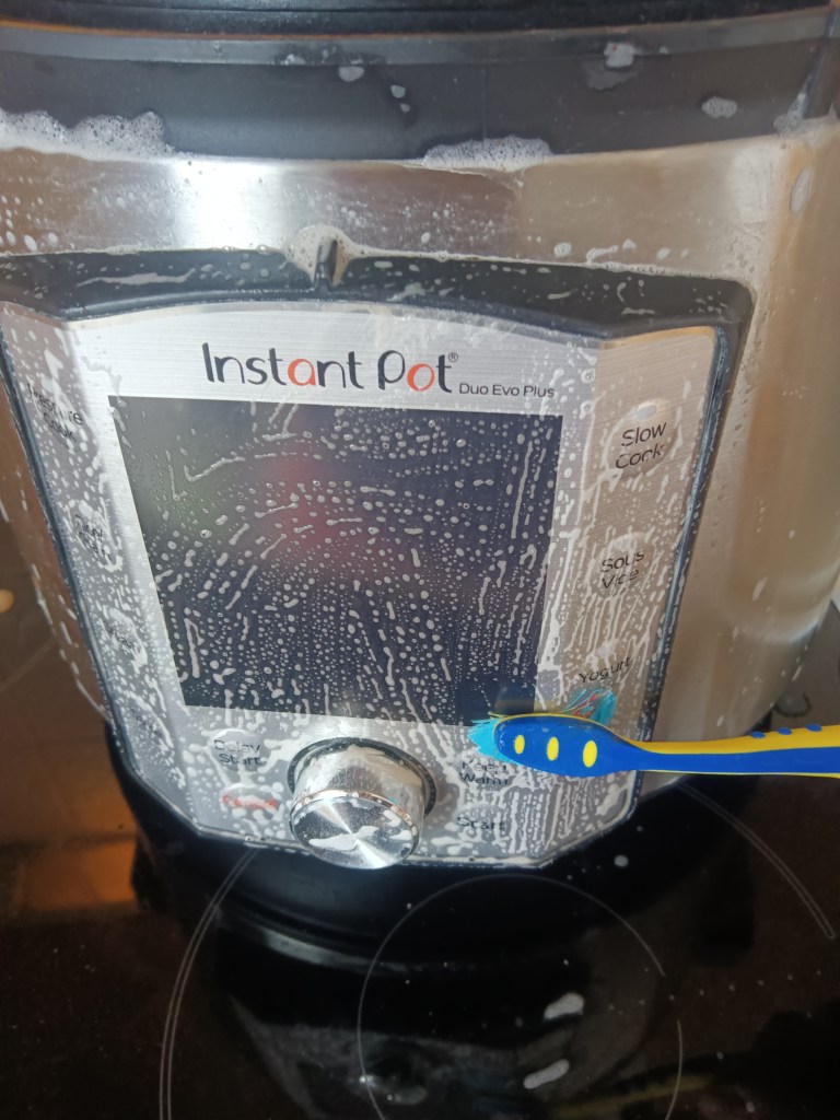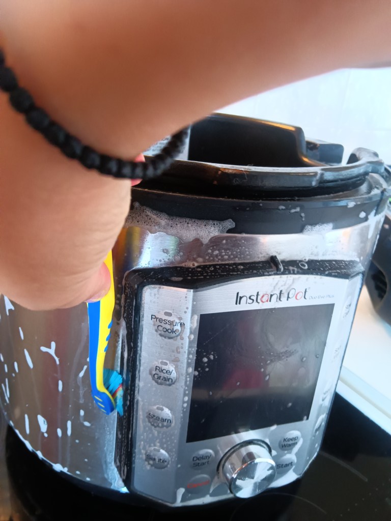 3. Am pus CIF pe o periuță de dinți și am frecat bine în zonele mai greu accesibile (cea de la mânere, cea de unde se sigilează capacul, cea din zona butoanelor multicooker-ului).