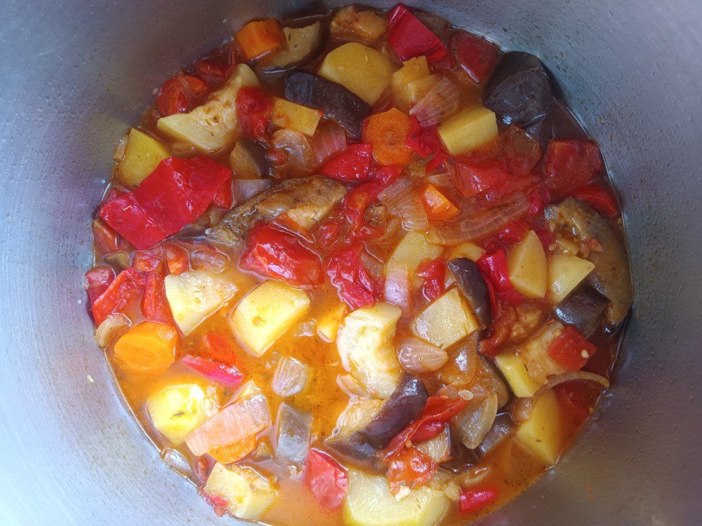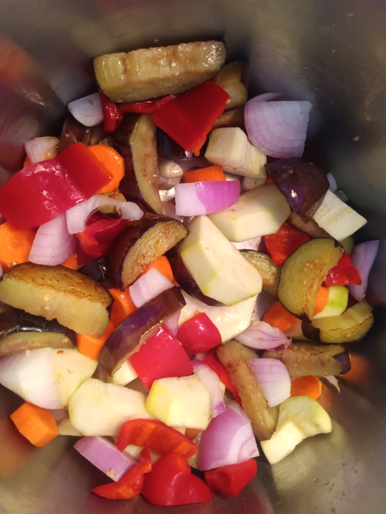 Am adăugat două linguri de ulei de măsline și am pornit funcția SAUTÉ. Întâi am adăugat vinetele. Când acestea au prins culoare, am adăugat dovlecelul și ardeiul kapia. După două minute, am pus ceapa, usturoiul, morcovul și roșiile tăiate. După ce au început să se caramelizeze, am pus și roșiile tăiate, roșiile din conservă și cartofii. Am amestecat bine și am oprit funcția SAUTÉ.