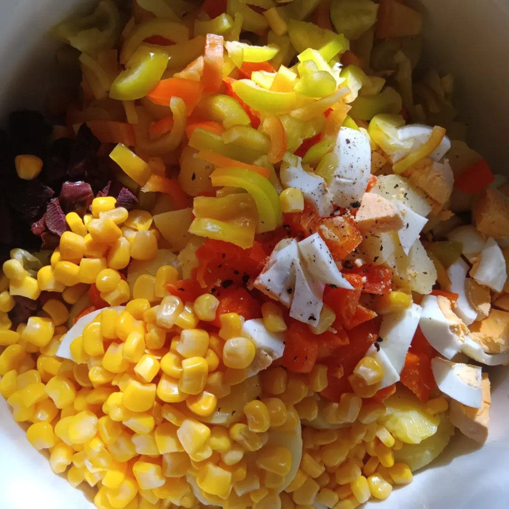 3. Între timp am tăiat ardeiul gras, măslinele, ouăle fierte și am pregătit sosul din ulei de măsline, oțet de mere, sare, piper, boia dulce de ardei.