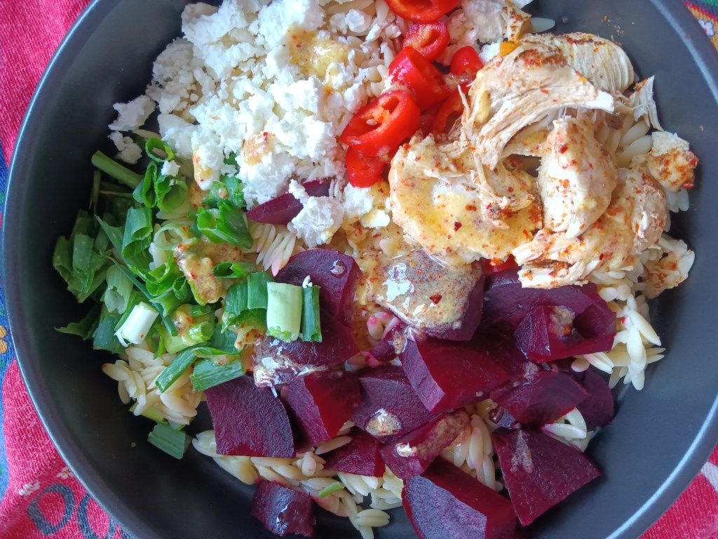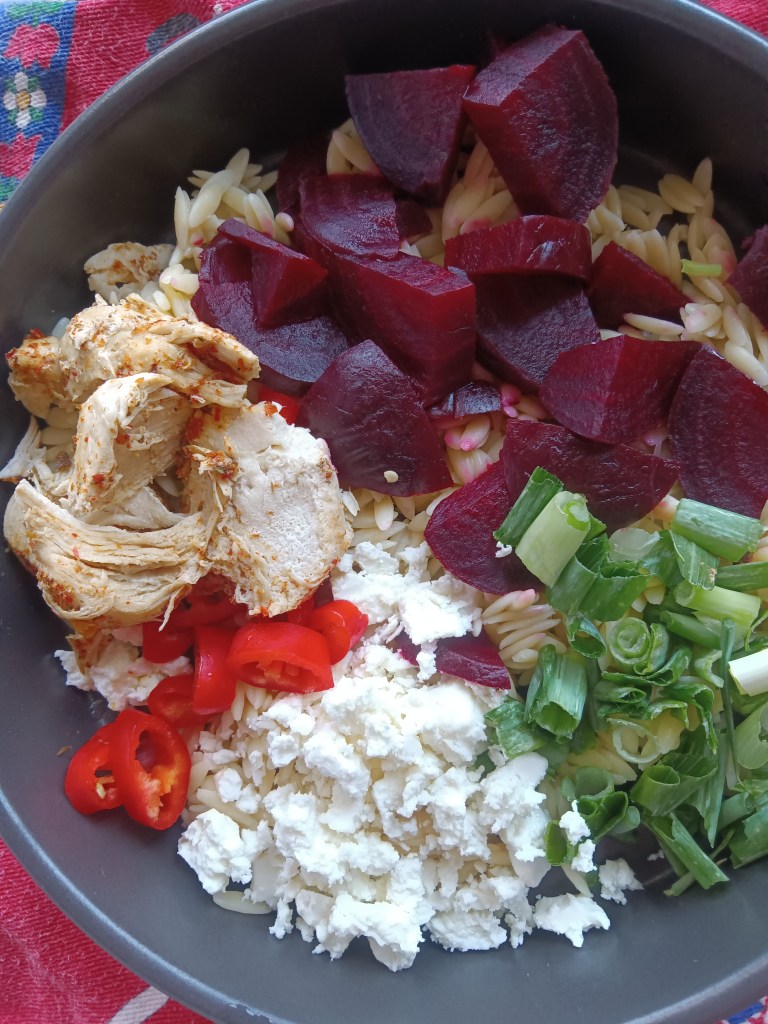 Un prânz rapid și sănătos este salata asta de paste cu pui, sfeclă și feta. E gata in mai puțin de 20 de minute