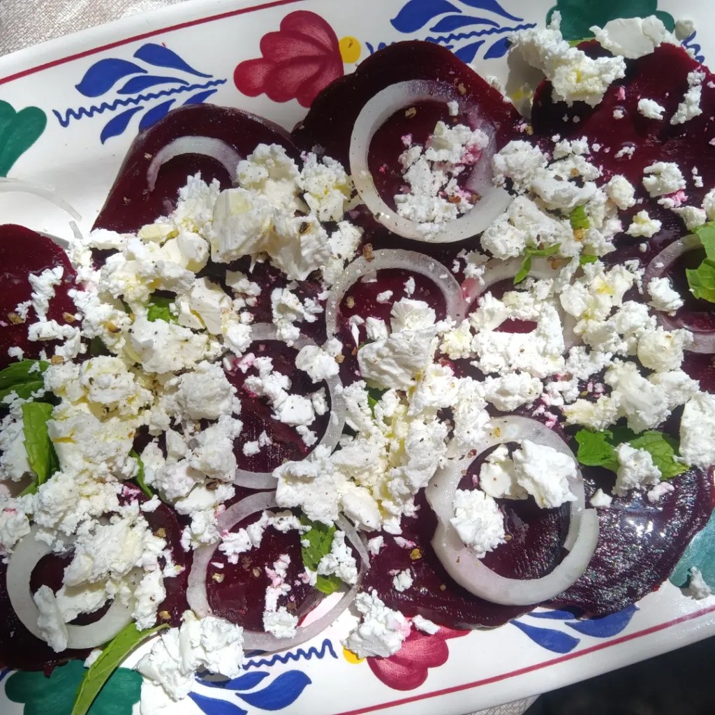 2. Când a expirat timpul, am scos rapid presiunea. Am lăsat sfecla să se răcească și apoi am curățat coaja, am tăiat rondele două sfecle și le-am pus pe un platou. Peste ele am adăugat ceapa tăiată, menta, feta. Am pus deasupra uleiul de măsline, oțetul, sarea, piperul și fulgii de ardei.