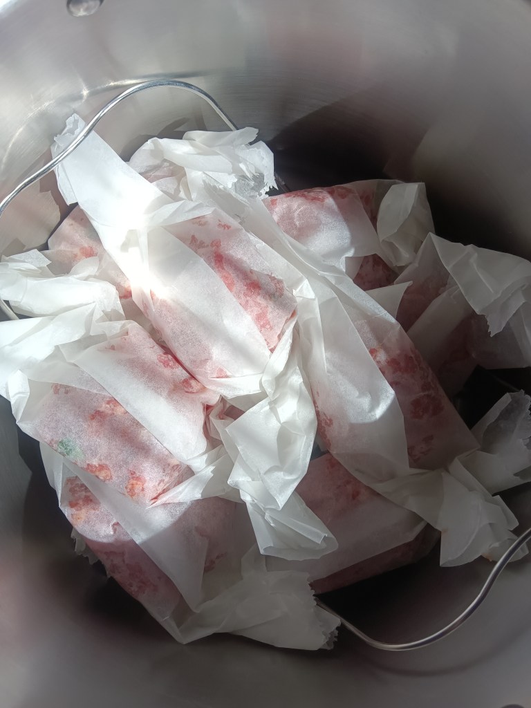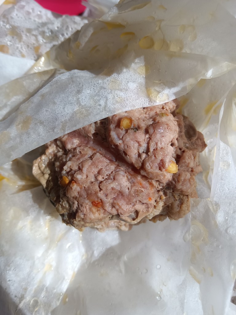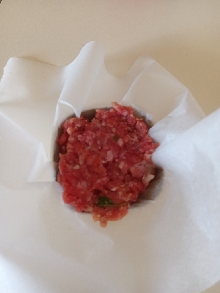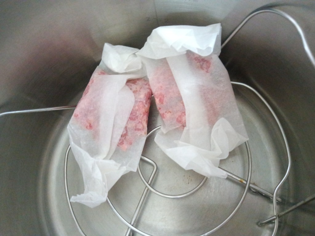 2. Am pus o cană cu apă în vasul de inox. Am adăugat trivetul și pe el am pus burgerii împachetați in folie de hârtie de copt. Dacă aveți presă pentru burgeri, îi pregătiți așa și apoi ii puneți fie in folie de aluminiu, fie in folie de hârtie de copt. Eu nu am presă, dar am folosit capacul de la un borcan de #ness (orice capac cu margini mai înalte e util pentru a face burgeri).