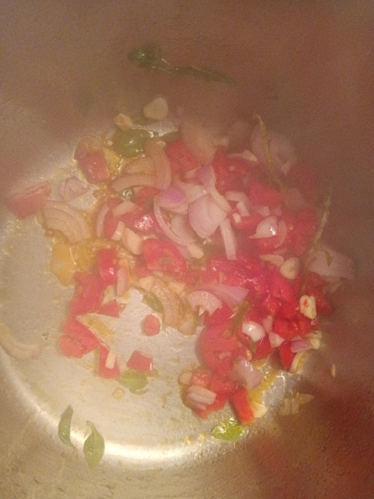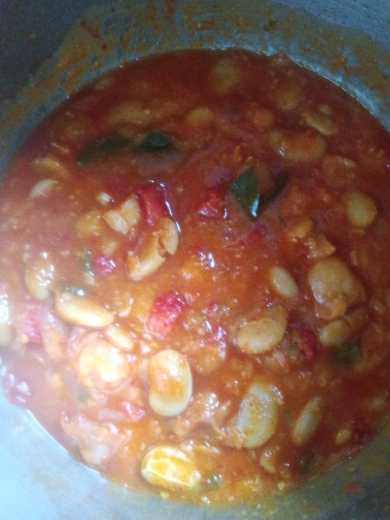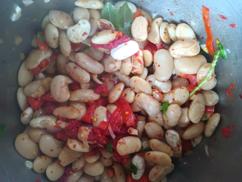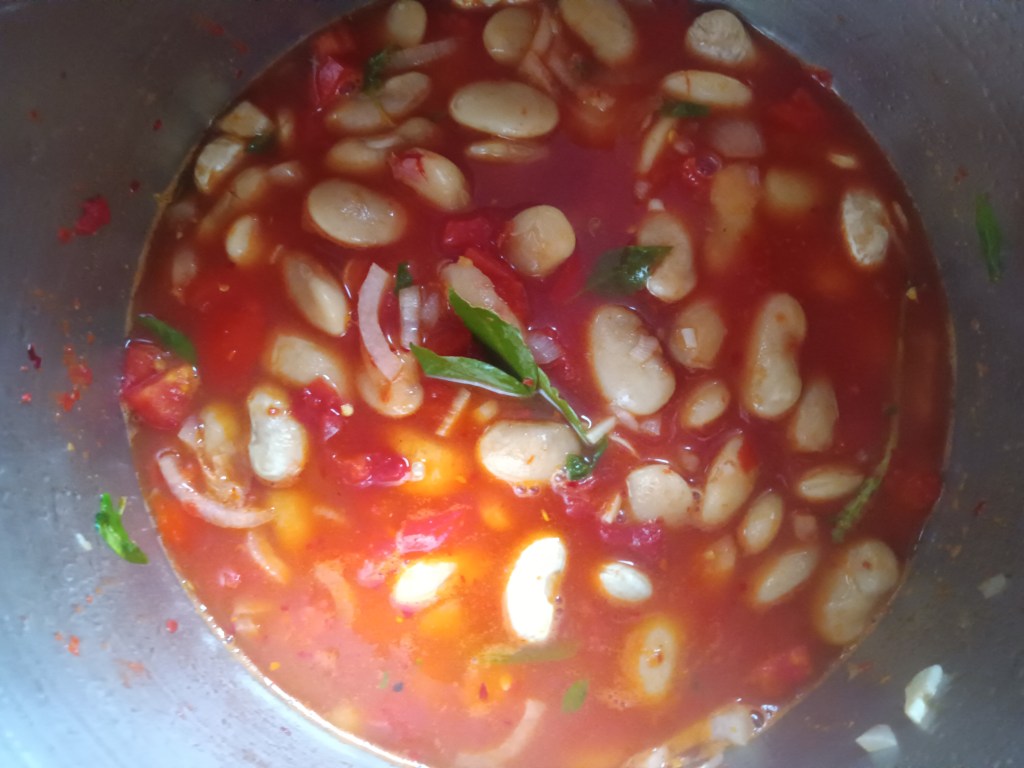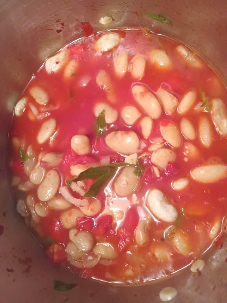2. Am scurs fasolea și am pus la fiert apa în cana electrică. Între timp, am pus ulei de măsline în vasul de inox și am pornit setarea SAUTE. Am adăugat frunzele de busuioc și crenguțele, am pus ceapa, usturoiul , roșiile și fasolea fiartă. Am adăugat condimentele și am amestecat totul bine. Am adăugat apă fierbinte până la nivelul fasolei. Am oprit setarea SAUTÉ.