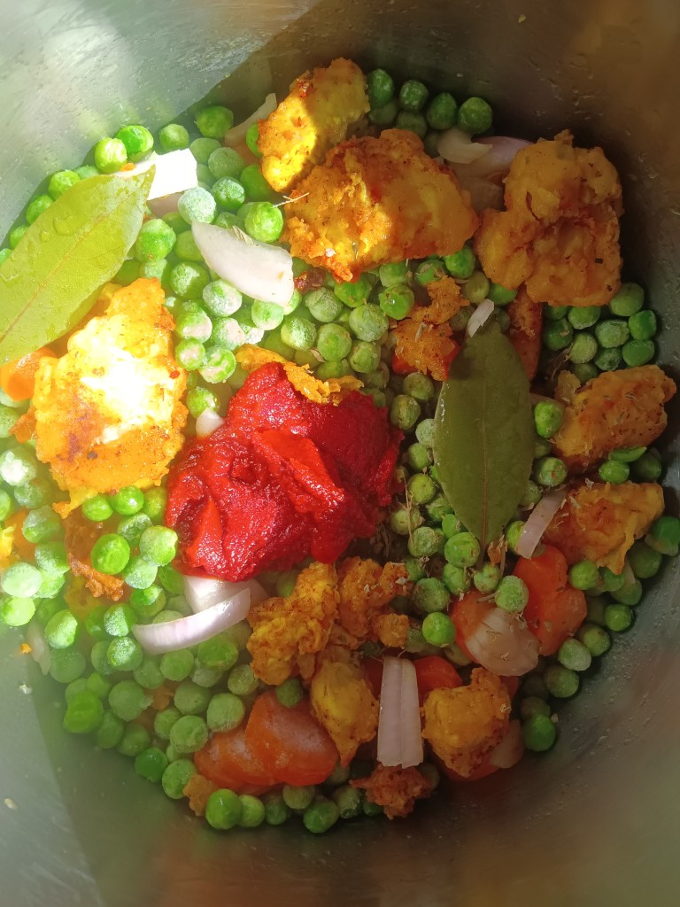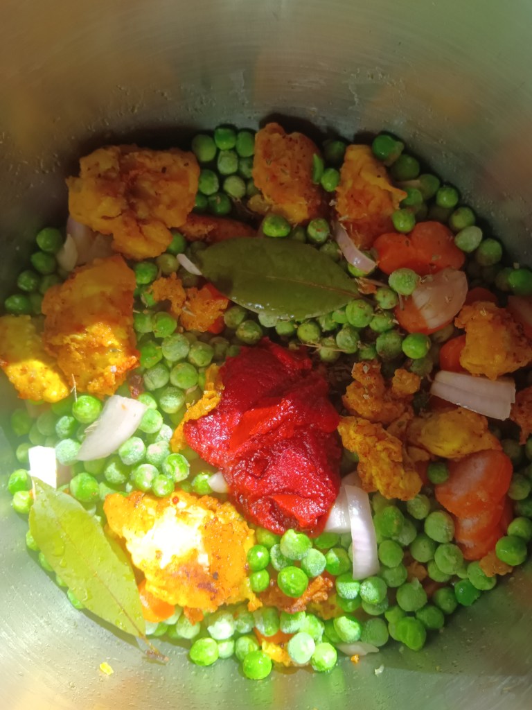 3. Am adăugat un morcov tăiat rondele, o ceapă, mazărea congelată și o lingură de bulion de roșii. Am amestecat bine, asigurându-mă că ”rad” orice bucată prinsă de fundul vasului de inox. Am adăugat apoi condimentele rămase, foile de dafin și apa fierbinte. Am amestecat totul și am închis capacul.