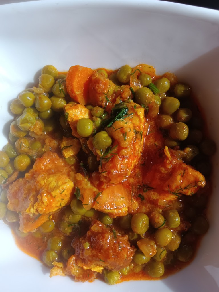 Prânzul de azi constă în mâncare de mazăre cu piept de pui și mărar.
