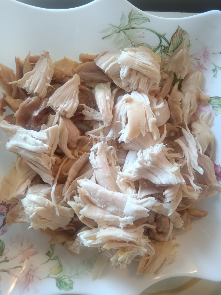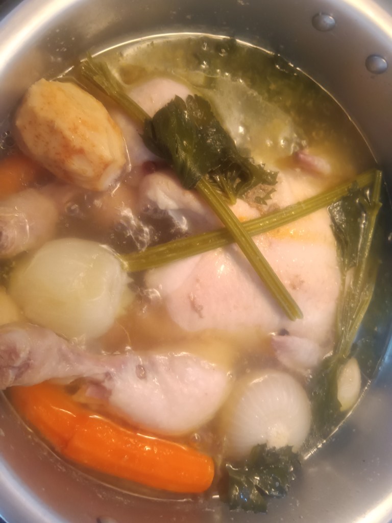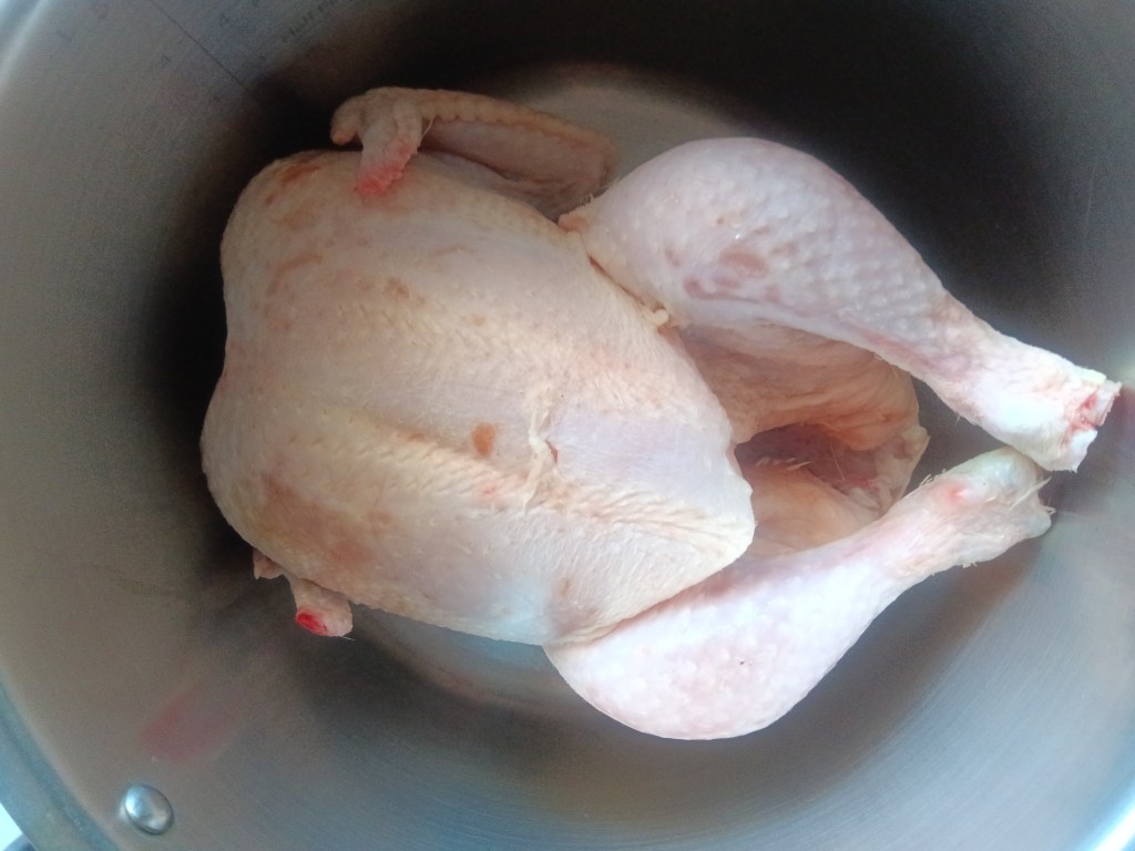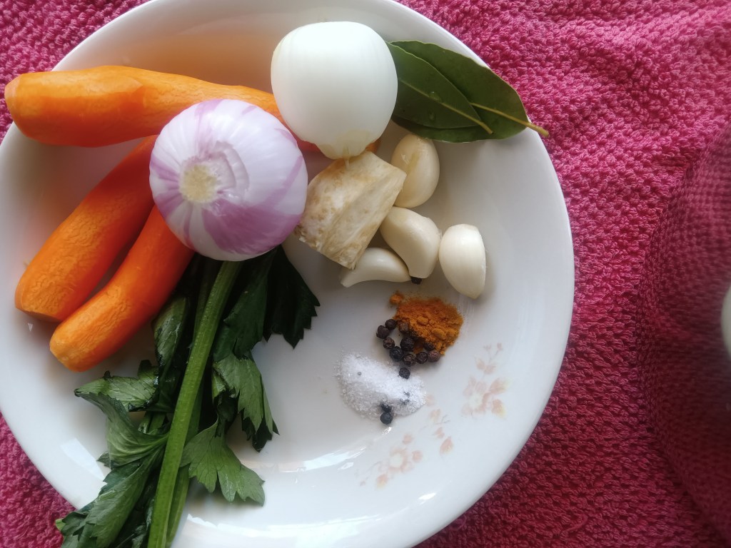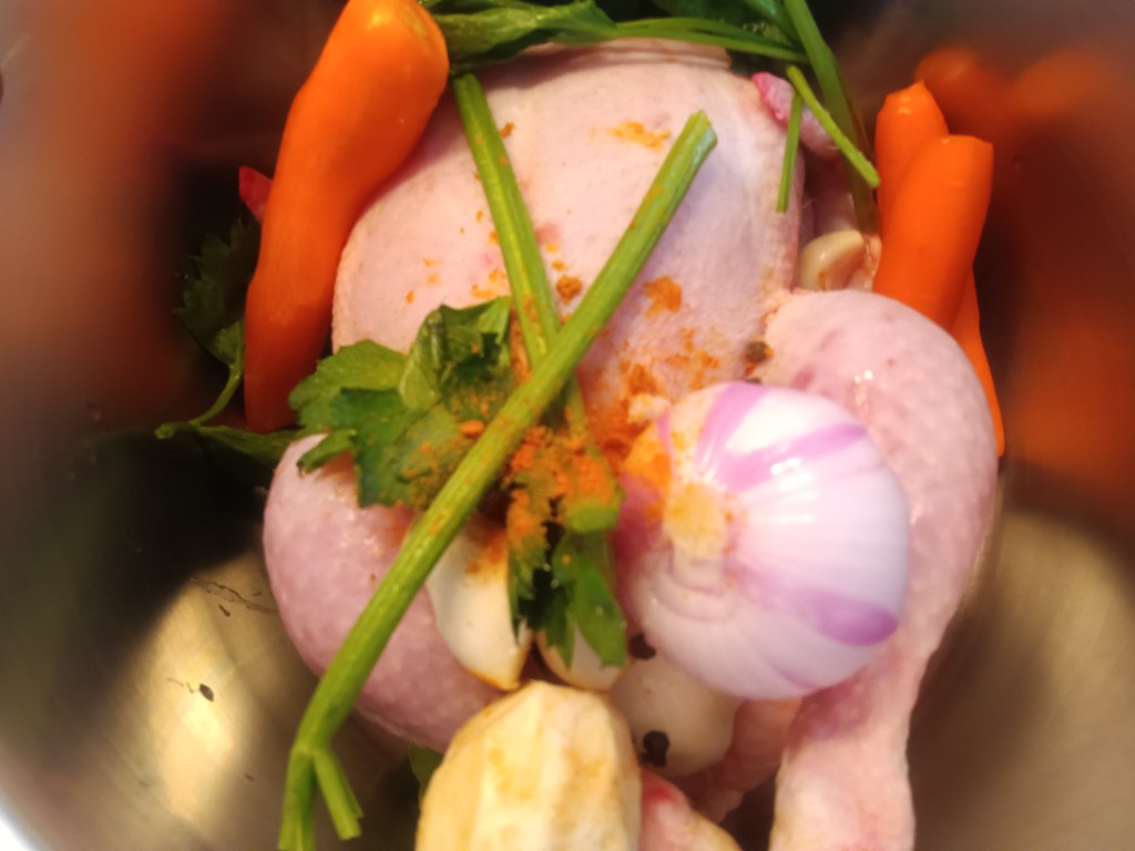 1. În vasul de inox am pus puiul intreg. Am adăugat ceapa, morcovii, țelina, usturoiul și condimentele (nu am pus mărarul, îl adaug la final). Am pus toate legumele întregi.