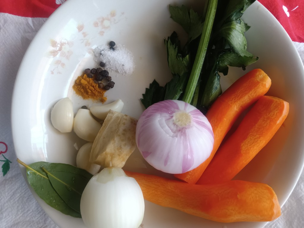 ✅ condimente: sare, piper, boia de ardei dulce, cimbru, jumătate de linguriță de curcuma, două foi de dafin, jumătate de linguriță de boabe de piper negru, mărar