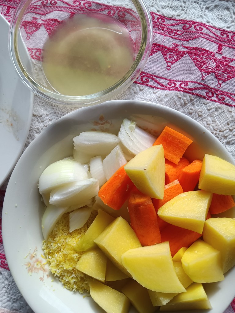 ✅ condimente: jumătate de linguriță de sare, un sfert de linguriță de scorțișoară, un sfert de linguriță de nucșoară, o linguriță de rozmarin, trei frunze de dafin