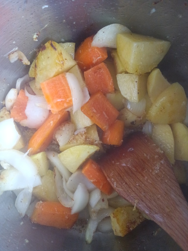 1. Am pregătit mușchiul de vită, tăindu-l în bucăți potrivite. Am activat funcția SAUTÉ și am pus toate bucățile de carne la prăjit, cât să prindă culoare pe toate părțile (aproximativ două minute pentru fiecare parte). Când carnea a fost gata, am scos-o și am adăugat în vas morcovii, ceapa, usturoiul și cartofii tăiați grosier (vor sta 60 de minute la programul cu abur, iar dacă le vom tăia mai mici se vor topi în vas). Am dezactivat opțiunea SAUTÉ.