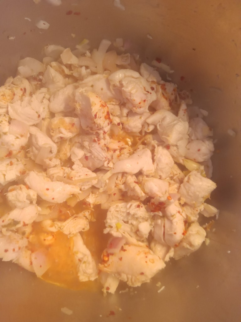 1. În multicookerul #instantpot am setat funcția SAUTÉ, am pus o lingură de ulei și jumătate de lingură de unt. Am adăugat bucățile de pui. După trei minute, am pus ceapa și usturoiul. Am oprit funcția de sotare.
