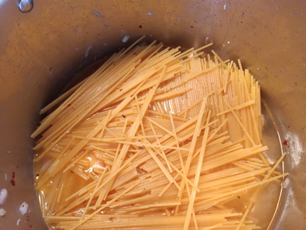2. Am adăugat spaghetele rupte la mijloc și am pus apă cât să ajungă la nivelul pastelor. Am selectat Pressure Cook, High, 5 minute (dacă pastele ar fi fost gătite la aragaz, ar fi avut nevoie de 9 minute)