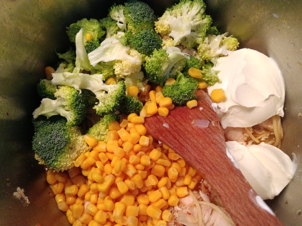 4. Când a expirat timpul, am eliberat rapid presiunea și am deschis capacul. Am adăugat porumbul, broccoli și crema de brânză.