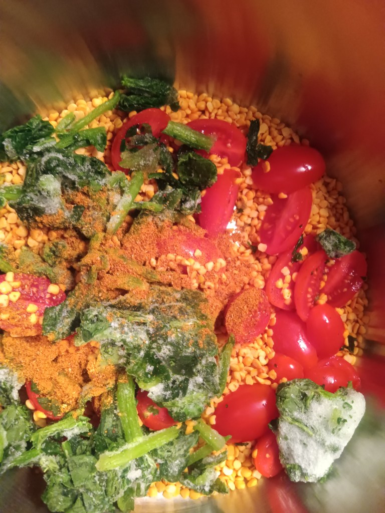1. Am pus o lingură de ulei de măsline în vasul de inox. Am adăugat lintea, roșiile tăiate în jumătate, spanacul înghețat și condimentele.