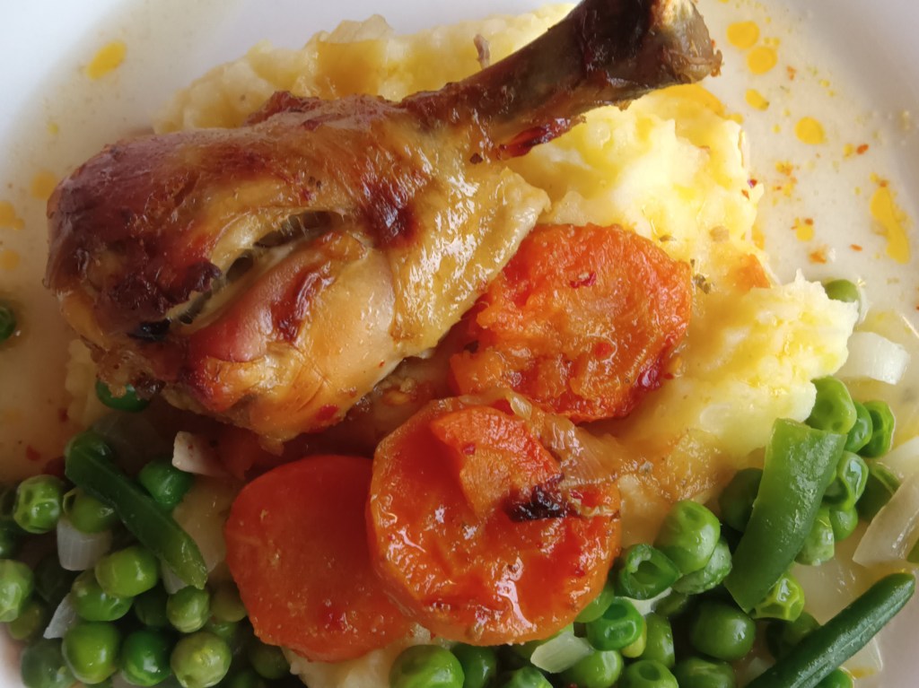 Prânzul de astăzi a fost alcătuit din pulpele astea de pui cu piure și legume.