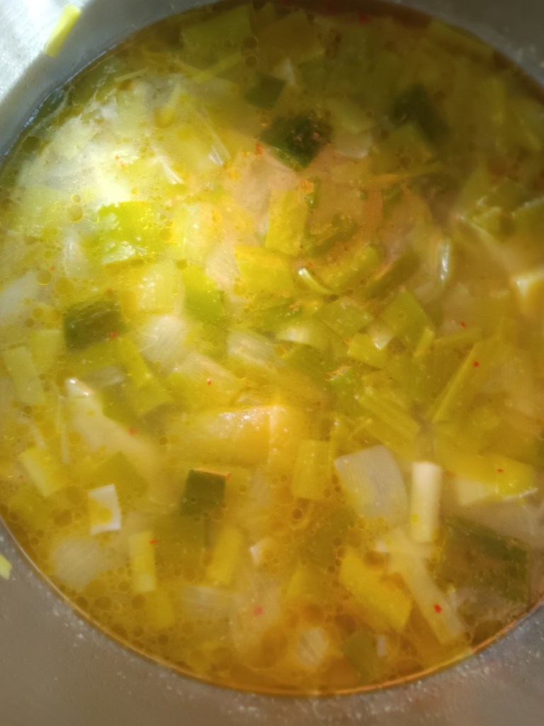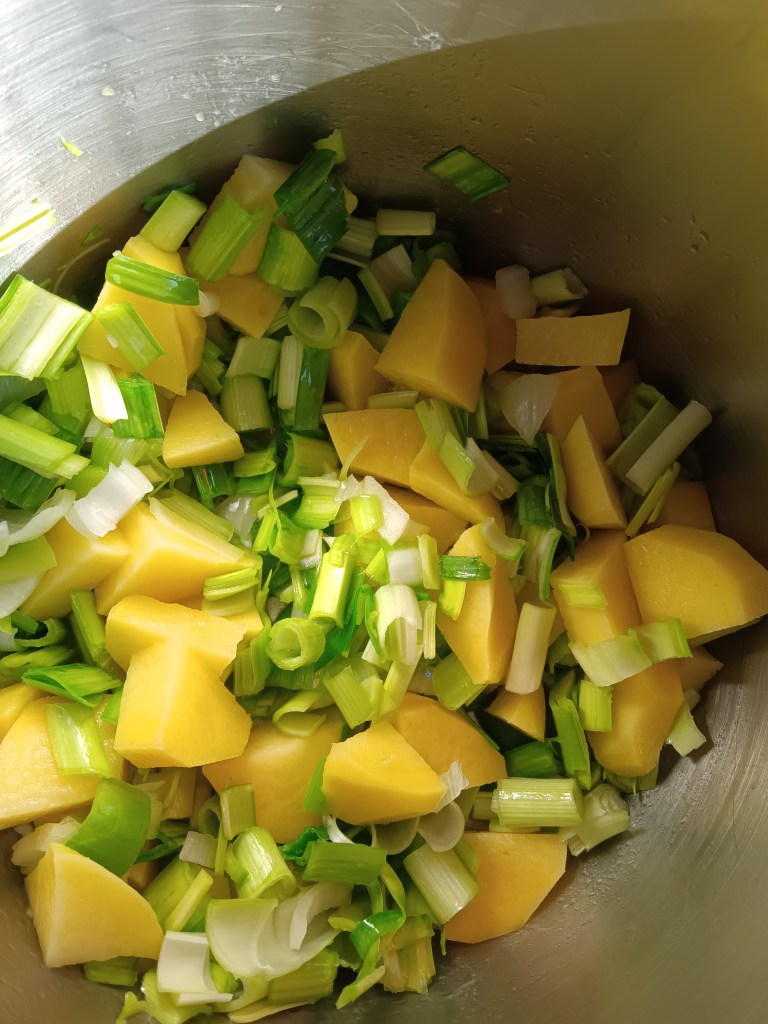 2. Am pus la sotat prazul și după două minute am adăugat ceapa, usturoiul și cartofii.