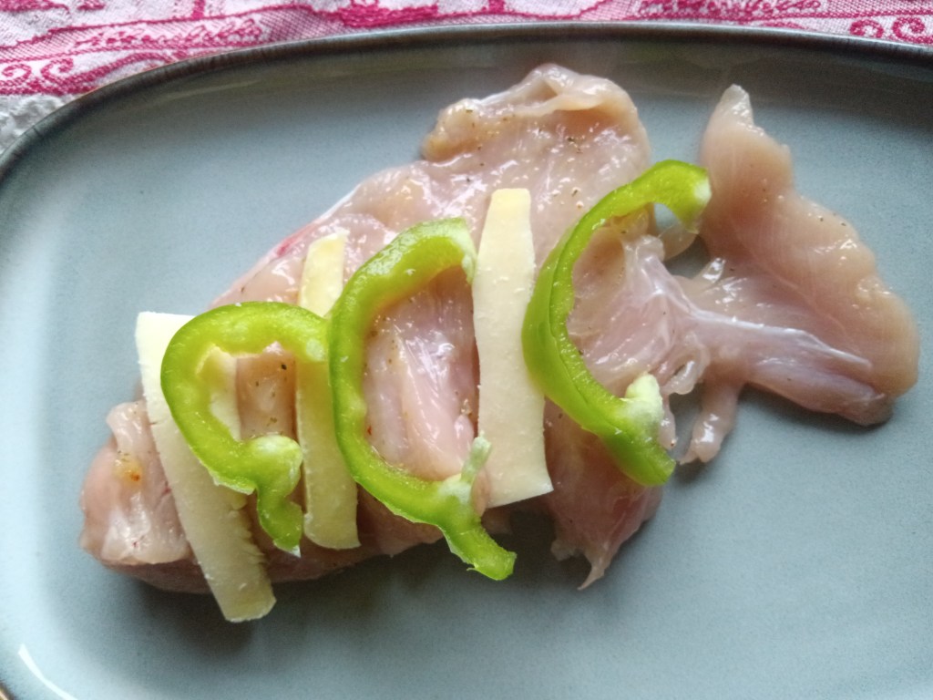 1. Am început prin a pregăti un amestec din usturoiul ras, condimentele și o lingură de ulei de măsline. Apoi am pregătit pieptul de pui: am tăiat fiecare piept de pui la mijloc, l-am uns cu amestecul făcut mai devreme și am pus câte două – trei felii de cașcaval și ardei (diferă în funcție de mărimea pieptului de pui). Apoi am „închis” fiecare piept de pui, prinzând cu scobitori și l-am uns și în afară cu marinata de mai sus.