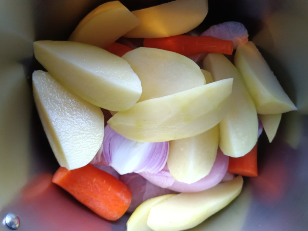 1. Am pus în vasul de inox pulpele de pui. Am adăugat ceapa tăiată în două, morcovul și cartofii tăiați în sferturi. Am pus condimentele și usturoiul.
