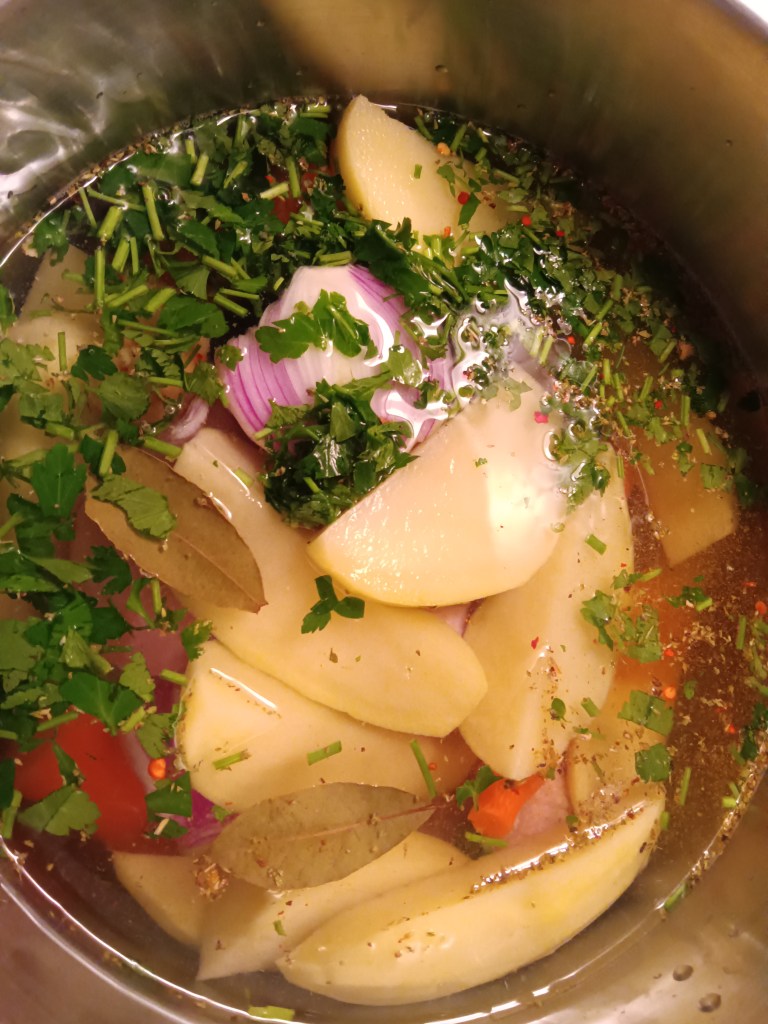 ✅ condimente: sare, piper, două frunze de dafin, o linguriță cimbru uscat, o linguriță de curcuma