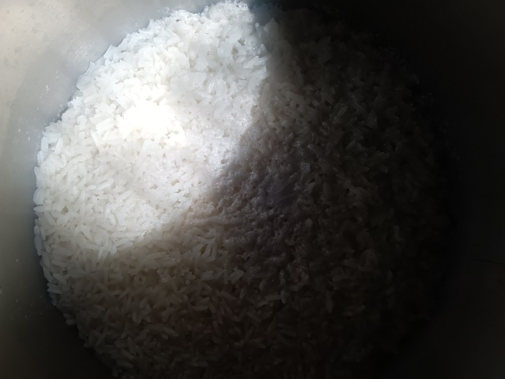 1. Am pus în vasul de inox uleiul, apa, orezul, laptele de cocos și sarea. Am amestecat bine.